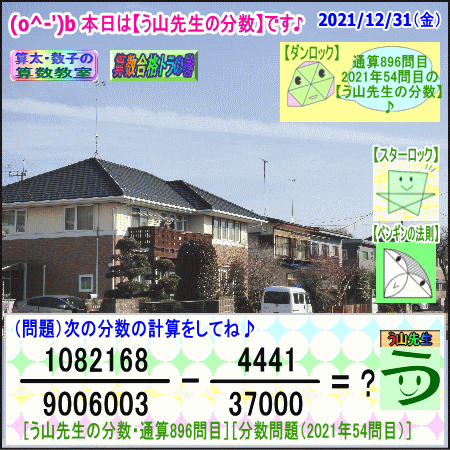 [う山雄一先生の分数]【分数896問目】算数・数学天才問題[2021年12月31日]Fraction □──────────────────□ 【算太・数子の算数教室】(R) 【算数合格トラの巻】 【う山TV(スタディ)】 【う山TV(バラエティ)】 【カンブリア・アカデミー】 □──────────────────□ (o^-')b 大人気☆[う山先生式・分数計算]の問題です♪ □──────────────────□ □ 2021/12/31(金曜) □ (o^-')b 【う山先生の分数・通算896問目】 [分数問題(2021年54問目)] 本日は2021年12月31日です。 次の分数計算をしてね♪ 1082168/9006003 - 4441/37000 = ? 【答え】後程♪ □ □──────────────────□ (*^ー^)ノ 本日も面白い分数問題を作りました☆ 分子・分母ともどうなるかな♪ □ [Fraction of Professor Uyama] доля Frakcja Fracao □──────────────────□ 算数・数学・家庭教師・個別指導・質問教室 □──────────────────□ □□□□□□□□□□□□□□□□□□□□ #分数 #う山先生の分数 #算数 #算数合格トラの巻 #数学 #解けたら天才 #家庭教師 #う山TV #う山先生 #う山雄一先生 #算太数子の算数教室 #算太数子 #算太くん #数子ちゃん #オルドビスキー博士 #シルルちゃん #デボン君 #白亜紀先生 #カンブリアアカデミー #勉強 #勉強垢 #計算問題 #数学垢 #数学教えて #数学教える #中学受験 #中学入試 #高校入試 #高校受験 #相互フォロー □ □□□□□□□□□□□□□□□□□□□□ [発行者氏名]【う山雄一】 [発行者web]【算数合格トラの巻】 [発行者web]【算太・数子の算数教室】(R) [著作]【算太・数子の算数教室】(R) 「さんた・かずこのさんすうきょうしつ」 [著作]【算遊記】 □ [メインサイト]う山先生のHP https://uyama.theblog.me/ □ [中学受験・算数]メイン http://uyama.aikotoba.jp/ [中学受験・算数]サブ https://sansu.theblog.me/ http://santakazuko.wix.com/uyama □ [成績表・偏差値アップ] http://uyama.aikotoba.jp/seiseki/seiseki.html □ [算遊記(さんゆうき)]算蔵法師・算悟空 http://www.geocities.jp/san_yu_ki/(←工事中) □ [仕事用フェイスブック] https://www.facebook.com/kazuko.santa.5/ □ [全般メール] ??????@gmail.com □ [中学受験・仕事用メール] ??????@gmail.com □ [ブログ]【算数合格トラの巻】 http://ameblo.jp/sansu/ http://uyama.blog.jp/ https://blog.goo.ne.jp/sansu_gokaku □ [ブログ]【算太・数子の算数教室】(R) http://ameblo.jp/santa-kazuko/ http://blog.goo.ne.jp/santa_kazuko http://santakazuko.wordpress.com/ http://santa-kazuko.at.webry.info/ http://santa-kazuko.blogspot.jp/ http://ch.nicovideo.jp/santa-kazuko http://santa-kazuko.blog.jp/ □ [ブログ]【う山先生】 http://happy.ap.teacup.com/uyama/ http://sansugokaku.blog.fc2.com/ https://uyama-sensei.hatenablog.com/ □ [ブログ]【オルドビスキー博士】 http://ameblo.jp/ordovisky/ □ [ブログ]【う山TV】 https://ameblo.jp/uyama-tv/ □ [動画一覧]【う山TV】(スタディ/バラエティ) http://uyama.aikotoba.jp/3-uyama-tv.html □ [動画一覧]【う山TV】 https://uyama-tv.themedia.jp/ □ [作曲一覧]【う山TV】(作曲) https://uyama-tv.amebaownd.com/ □ [分数、楽しい!]シリーズ [分数で算数・数学の天才になろう♪]シリーズ [知的ゲーム]シリーズ [一瞬で解こう!]シリーズ [解けたら天才♪]シリーズ [家庭教師]シリーズ [算数・面白い問題]シリーズ [算数・数学ファイル/SSファイル]シリーズ 【音楽・作曲】シリーズ 【空耳】シリーズ 【恋愛探偵サララ】シリーズ 【ランキング】シリーズ □ □ 【毎日の問題ブログ】一覧(お好きなブログを登録してね♪) http://uyama.aikotoba.jp/2-blog.html □ □□□□□□□□□□□□□□□□□□□□ ☆ ☆ ☆ ☆ ☆ ☆ ☆ ☆ ☆ ☆ ☆