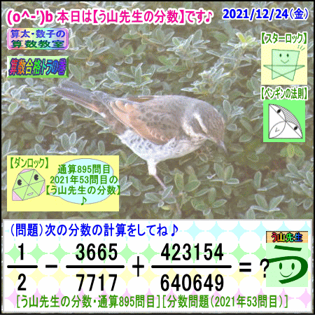 [う山雄一先生の分数]【分数895問目】算数・数学天才問題[2021年12月24日]Fraction □──────────────────□ 【算太・数子の算数教室】(R) 【算数合格トラの巻】 【う山TV(スタディ)】 【う山TV(バラエティ)】 【カンブリア・アカデミー】 □──────────────────□ (o^-')b 大人気☆[う山先生式・分数計算]の問題です♪ □──────────────────□ □ 2021/12/24(金曜) □ (o^-')b 【う山先生の分数・通算895問目】 [分数問題(2021年53問目)] 本日は2021年12月24日です。 次の分数計算をしてね♪ 1/2 - 3665/7717 + 423154/640649 = ? 【答え】後程♪ □ □──────────────────□ (*^ー^)ノ 本日も面白い分数問題を作りました☆ 分子・分母ともどうなるかな♪ □ [Fraction of Professor Uyama] доля Frakcja Fracao □──────────────────□ 算数・数学・家庭教師・個別指導・質問教室 □──────────────────□ □□□□□□□□□□□□□□□□□□□□ #分数 #う山先生の分数 #算数 #算数合格トラの巻 #数学 #解けたら天才 #家庭教師 #う山TV #う山先生 #う山雄一先生 #算太数子の算数教室 #算太数子 #算太くん #数子ちゃん #オルドビスキー博士 #シルルちゃん #デボン君 #白亜紀先生 #カンブリアアカデミー #勉強 #勉強垢 #計算問題 #数学垢 #数学教えて #数学教える #中学受験 #中学入試 #高校入試 #高校受験 #相互フォロー □ □□□□□□□□□□□□□□□□□□□□ [発行者氏名]【う山雄一】 [発行者web]【算数合格トラの巻】 [発行者web]【算太・数子の算数教室】(R) [著作]【算太・数子の算数教室】(R) 「さんた・かずこのさんすうきょうしつ」 [著作]【算遊記】 □ [メインサイト]う山先生のHP https://uyama.theblog.me/ □ [中学受験・算数]メイン http://uyama.aikotoba.jp/ [中学受験・算数]サブ https://sansu.theblog.me/ http://santakazuko.wix.com/uyama □ [成績表・偏差値アップ] http://uyama.aikotoba.jp/seiseki/seiseki.html □ [算遊記(さんゆうき)]算蔵法師・算悟空 http://www.geocities.jp/san_yu_ki/(←工事中) □ [仕事用フェイスブック] https://www.facebook.com/kazuko.santa.5/ □ [全般メール] ??????@gmail.com □ [中学受験・仕事用メール] ??????@gmail.com □ [ブログ]【算数合格トラの巻】 http://ameblo.jp/sansu/ http://uyama.blog.jp/ https://blog.goo.ne.jp/sansu_gokaku □ [ブログ]【算太・数子の算数教室】(R) http://ameblo.jp/santa-kazuko/ http://blog.goo.ne.jp/santa_kazuko http://santakazuko.wordpress.com/ http://santa-kazuko.at.webry.info/ http://santa-kazuko.blogspot.jp/ http://ch.nicovideo.jp/santa-kazuko http://santa-kazuko.blog.jp/ □ [ブログ]【う山先生】 http://happy.ap.teacup.com/uyama/ http://sansugokaku.blog.fc2.com/ https://uyama-sensei.hatenablog.com/ □ [ブログ]【オルドビスキー博士】 http://ameblo.jp/ordovisky/ □ [ブログ]【う山TV】 https://ameblo.jp/uyama-tv/ □ [動画一覧]【う山TV】(スタディ/バラエティ) http://uyama.aikotoba.jp/3-uyama-tv.html □ [動画一覧]【う山TV】 https://uyama-tv.themedia.jp/ □ [作曲一覧]【う山TV】(作曲) https://uyama-tv.amebaownd.com/ □ [分数、楽しい!]シリーズ [分数で算数・数学の天才になろう♪]シリーズ [知的ゲーム]シリーズ [一瞬で解こう!]シリーズ [解けたら天才♪]シリーズ [家庭教師]シリーズ [算数・面白い問題]シリーズ [算数・数学ファイル/SSファイル]シリーズ 【音楽・作曲】シリーズ 【空耳】シリーズ 【恋愛探偵サララ】シリーズ 【ランキング】シリーズ □ □ 【毎日の問題ブログ】一覧(お好きなブログを登録してね♪) http://uyama.aikotoba.jp/2-blog.html □ □□□□□□□□□□□□□□□□□□□□ ☆ ☆ ☆ ☆ ☆ ☆ ☆ ☆ ☆ ☆ ☆