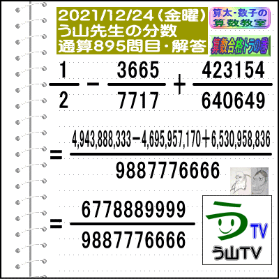 [う山先生・分数]【算数・数学】895問目【う山先生からの挑戦状】[2021年12月24日] □──────────────────□ (o^-')b【算数合格トラの巻】 【算太・数子の算数教室】(R) 【う山TV】 【カンブリア・アカデミー】 [Fraction of Professor Uyama] □──────────────────□ □ 2021/12/24(金曜) □ (o^-')b 【う山先生の分数・通算895問目】 [分数問題(2021年53問目)] 本日は2021年12月24日です。 次の分数計算をしてね♪ 1/2 - 3665/7717 + 423154/640649 = ? □ □──────────────────□ □ (*^ー^)ノ 今回も、4年生・5年生でも、 頑張れば、楽しく解ける分数問題です☆ [う山先生の分数]は、 昨年2020年迄で、 合計【842問】作りました☆ 今年も、わかりやすく通し番号(通算番号)と、 その年の作成番号でいきます♪ □ 本日も人気の【う山雄一先生の分数問題】です! 楽しく解いてみて下さい♪(^^) □ [YouTube]の【う山TV】の分数動画も参照してね☆ □ 本日も、面白い分数問題を作成しました! 分母・分子はどうなるかな? 頑張って、10分以内で正解して下さい。 『算数は面白い!』を実感してね♪(^0^)/ □ [計算問題]を楽しんで解いて、 【算数は面白い!で算数合格】しましょう☆(o^-')b □ う山先生の予想正答率は、 堂々と正解 → 9%以下 頑張って正解 → 8%以下 頑張ったけど惜しくも不正解 → 7%以下 約分可能かどうか悩んで不正解 →6%以下 です。 □ ではレッツ・ゴー!! ☆(^o^)/ □ 答えは、 ↓ ↓ ↓ ↓ ↓ ↓ ↓ ↓ ↓ □ ==================== □ ♪( ´θ`)ノ 【う山先生の分数・通算895問目】解答 [分数問題(2021年53問目)] □ 【答え】[6778889999/9887776666]です。 (分子=6778889999→10桁) (分母=9887776666→10桁) □ (解法) 1/2 - 3665/7717 + 423154/640649 =4,943,888,333/9887776666 -4,695,957,170/9887776666 +6,530,958,836/9887776666 =6778889999/9887776666 □ □ ==================== □ ♪( ´θ`)ノ 本日も面白い数字の分数を作成しました♪ □ 分子は[6778889999=6が1個+7が2個+8が3個+9が4個→10桁] 分母は[9887776666=9が1個+8が2個+7が3個+6が4個→10桁] です☆ □ 本日は、9・8・7・6の面白い分数問題を作成しました☆ □ ♪( ´ ▽ ` )ノ もちろん、答えは既約分数です☆ □ □ ==================== □ (*^ー^)ノ[参考] □ (2=素数) (7717=素数) (640649=素数) (3665=5×733) (423154=2×23×9199) (6778889999[10桁]=7×29251×33107) (9887776666[10桁]=2×7717×640649) □ □ □──────────────────□ #分数 #う山先生の分数 #算数 #算数合格トラの巻 #数学 #解けたら天才 #家庭教師 #う山TV #う山先生 #う山雄一先生 #算太数子の算数教室 #算太数子 #算太くん #数子ちゃん #オルドビスキー博士 #シルルちゃん #デボン君 #白亜紀先生 #カンブリアアカデミー #勉強 #勉強垢 #計算問題 #数学垢 #数学教えて #数学教える #中学受験 #中学入試 #高校入試 #高校受験 #相互フォロー □ □□□□□□□□□□□ [参考] 【う山先生の分数】通算895問目 [2013年]40問 [2014年]135問 [2015年]143問 [2016年]131問 [2017年]128問 [2018年]108問 [2019年]105問 [2020年]52問 □ [2021年] 2021/01/01(金)[1/2021] 2021/01/01(金)[1/2021] 2021/01/08(金)[1/2021] 2021/01/15(金)[1/2021] 2021/01/22(金)[1/2021] 2021/01/29(金)[2020/2021] 2021/02/05(金)[55555555555/222255552222] 2021/02/12(金)[111111211111/222222122222] 2021/02/19(金)[111111211111/222222122222] 2021/02/26(金)[155555/22666666] □ 2021/03/05(金)[55555333/3333555555] 2021/03/12(金)[31231231/312312312] 2021/03/19(金)[222222222223/333333333332] 2021/03/26(金)[5/3333344444] 2021/04/02(金)[555555555/3333344444] 2021/04/09(金)[4444499999/444444999999] 2021/04/16(金)[55555/4444446666] 2021/04/23(金)[44444/2222223333] 2021/04/30(金)[5555555/4444446666] 2021/05/07(金)[555555577777/555557777777] □ 2021/05/14(金)[111141111/11111411111] 2021/05/21(金)[22222522222/55555255555] 2021/05/28(金)[55555/2288888888] 2021/06/04(金)[55555/6666664444] 2021/06/11(金)[111111111116/666666666661] 2021/06/18(金)[666666666661/888888888881] 2021/06/25(金)[55555655555/66666566666] 2021/07/02(金)[22227772222/77772227777] 2021/07/09(金)[7979797979/79797979797] 2021/07/16(金)[666666166666/777777177777] □ 2021/07/23(金)[22222222222/333337733333] 2021/07/30(金)[33333333333/77777xxx-xxx-xxxxx] 2021/08/06(金)[75757575757/86868686868] 2021/08/13(金)[88888888888/333333111111] 2021/08/20(金)[123454321/87654345678] 2021/08/27(金)[88888888888/222222777777] 2021/09/03(金)[22882288/333999333999] 2021/09/10(金)[999999999/1xxx-xxx-xxxxx] 2021/09/17(金)[99999999999/1xxx-xxx-xxxxx] 2021/09/24(金)[9/1xxx-xxx-xxxxx] □ 2021/10/01(金)[1/1xxx-xxx-xxxxx] 2021/10/08(金)[1/1xxx-xxx-xxxxx] 2021/10/15(金)[1/1xxx-xxx-xxxxx] 2021/10/22(金)[1/1xxx-xxx-xxxxx] 2021/10/29(金)[1/1xxx-xxx-xxxxx] 2021/11/05(金)[1/1xxx-xxx-xxxxx] 2021/11/12(金)[1/1xxx-xxx-xxxxx] 2021/11/19(金)[1/1xxx-xxx-xxxxx] 2021/11/26(金)[1/1xxx-xxx-xxxxx] 2021/12/03(金)[1/1xxx-xxx-xxxxx] □ 2021/12/10(金)[111111111111/111111111112] 2021/12/17(金)[11111222222/11111777777] 2021/12/24(金)[6778889999/9887776666]←本日(o^-')b □ □ □□□□□□□□□□□ □ □──────────────────□ 算数・数学・家庭教師・個別指導・質問教室 □──────────────────□ □ □□□□□□□□□□□□□□□□□□□□ [氏名]【う山雄一】 [動画]【う山TV(スタディ)】 [動画]【う山TV(バラエティ)】 [著書]【算太・数子の算数教室】(R