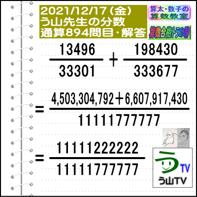 [う山先生・分数]【算数・数学】894問目【う山先生からの挑戦状】[2021年12月17日] □──────────────────□ (o^-')b【算数合格トラの巻】 【算太・数子の算数教室】(R) 【う山TV】 【カンブリア・アカデミー】 [Fraction of Professor Uyama] □──────────────────□ □ 2021/12/17(金曜) □ (o^-')b 【う山先生の分数・通算894問目】 [分数問題(2021年52問目)] 本日は2021年12月17日です。 次の分数計算をしてね♪ 13496/33301 + 198430/333677 = ? □ □──────────────────□ □ (*^ー^)ノ 今回も、4年生・5年生でも、 頑張れば、楽しく解ける分数問題です☆ [う山先生の分数]は、 昨年2020年迄で、 合計【842問】作りました☆ 今年も、わかりやすく通し番号(通算番号)と、 その年の作成番号でいきます♪ □ 本日も人気の【う山雄一先生の分数問題】です! 楽しく解いてみて下さい♪(^^) □ [YouTube]の【う山TV】の分数動画も参照してね☆ □ 本日も、面白い分数問題を作成しました! 分母・分子はどうなるかな? 頑張って、10分以内で正解して下さい。 『算数は面白い!』を実感してね♪(^0^)/ □ [計算問題]を楽しんで解いて、 【算数は面白い!で算数合格】しましょう☆(o^-')b □ う山先生の予想正答率は、 堂々と正解 → 12%以下 頑張って正解 → 12%以下 頑張ったけど惜しくも不正解 → 17%以下 約分可能かどうか悩んで不正解 →17%以下 です。 □ ではレッツ・ゴー!! ☆(^o^)/ □ 答えは、 ↓ ↓ ↓ ↓ ↓ ↓ ↓ ↓ ↓ □ ==================== □ ♪( ´θ`)ノ 【う山先生の分数・通算894問目】解答 [分数問題(2021年52問目)] □ 【答え】[11111222222/11111777777]です。 (分子=11111222222→11桁) (分母=11111777777→11桁) □ (解法) 13496/33301 + 198430/333677 =4,503,304,792/11111777777+6,607,917,430/11111777777 =11111222222/11111777777 □ □ ==================== □ ♪( ´θ`)ノ 本日も面白い数字の分数を作成しました♪ □ 分子は[11111222222=1が5個+2が6個→11桁] 分母は[11111777777=1が5個+7が6個→11桁] です☆ □ 本日、12月17日に相応しい分数問題を作成しました☆ □ ♪( ´ ▽ ` )ノ もちろん、答えは既約分数です☆ □ □ ==================== □ (*^ー^)ノ[参考] □ (33301=素数) (333677=191×1747) (13496=2×2×2×7×241) (198430=2×5×19843) (11111222222[11桁]=2×5555611111) (11111777777[11桁]=191×1747×33301=33301×333677) □ □ □──────────────────□ #分数 #う山先生の分数 #算数 #算数合格トラの巻 #数学 #解けたら天才 #家庭教師 #う山TV #う山先生 #う山雄一先生 #算太数子の算数教室 #算太数子 #算太くん #数子ちゃん #オルドビスキー博士 #シルルちゃん #デボン君 #白亜紀先生 #カンブリアアカデミー #勉強 #勉強垢 #計算問題 #数学垢 #数学教えて #数学教える #中学受験 #中学入試 #高校入試 #高校受験 #相互フォロー □ □□□□□□□□□□□ [参考] 【う山先生の分数】通算894問目 [2013年]40問 [2014年]135問 [2015年]143問 [2016年]131問 [2017年]128問 [2018年]108問 [2019年]105問 [2020年]52問 □ [2021年] 2021/01/01(金)[1/2021] 2021/01/01(金)[1/2021] 2021/01/08(金)[1/2021] 2021/01/15(金)[1/2021] 2021/01/22(金)[1/2021] 2021/01/29(金)[2020/2021] 2021/02/05(金)[55555555555/222255552222] 2021/02/12(金)[111111211111/222222122222] 2021/02/19(金)[111111211111/222222122222] 2021/02/26(金)[155555/22666666] □ 2021/03/05(金)[55555333/3333555555] 2021/03/12(金)[31231231/312312312] 2021/03/19(金)[222222222223/333333333332] 2021/03/26(金)[5/3333344444] 2021/04/02(金)[555555555/3333344444] 2021/04/09(金)[4444499999/444444999999] 2021/04/16(金)[55555/4444446666] 2021/04/23(金)[44444/2222223333] 2021/04/30(金)[5555555/4444446666] 2021/05/07(金)[555555577777/555557777777] □ 2021/05/14(金)[111141111/11111411111] 2021/05/21(金)[22222522222/55555255555] 2021/05/28(金)[55555/2288888888] 2021/06/04(金)[55555/6666664444] 2021/06/11(金)[111111111116/666666666661] 2021/06/18(金)[666666666661/888888888881] 2021/06/25(金)[55555655555/66666566666] 2021/07/02(金)[22227772222/77772227777] 2021/07/09(金)[7979797979/79797979797] 2021/07/16(金)[666666166666/777777177777] □ 2021/07/23(金)[22222222222/333337733333] 2021/07/30(金)[33333333333/77777xxx-xxx-xxxxx] 2021/08/06(金)[75757575757/86868686868] 2021/08/13(金)[88888888888/333333111111] 2021/08/20(金)[123454321/87654345678] 2021/08/27(金)[88888888888/222222777777] 2021/09/03(金)[22882288/333999333999] 2021/09/10(金)[999999999/1xxx-xxx-xxxxx] 2021/09/17(金)[99999999999/1xxx-xxx-xxxxx] 2021/09/24(金)[9/1xxx-xxx-xxxxx] □ 2021/10/01(金)[1/1xxx-xxx-xxxxx] 2021/10/08(金)[1/1xxx-xxx-xxxxx] 2021/10/15(金)[1/1xxx-xxx-xxxxx] 2021/10/22(金)[1/1xxx-xxx-xxxxx] 2021/10/29(金)[1/1xxx-xxx-xxxxx] 2021/11/05(金)[1/1xxx-xxx-xxxxx] 2021/11/12(金)[1/1xxx-xxx-xxxxx] 2021/11/19(金)[1/1xxx-xxx-xxxxx] 2021/11/26(金)[1/1xxx-xxx-xxxxx] 2021/12/03(金)[1/1xxx-xxx-xxxxx] □ 2021/12/10(金)[111111111111/111111111112] 2021/12/17(金)[11111222222/11111777777]←本日(o^-')b □ □ □□□□□□□□□□□ □ □──────────────────□ 算数・数学・家庭教師・個別指導・質問教室 □──────────────────□ □ □□□□□□□□□□□□□□□□□□□□ [氏名]【う山雄一】 [動画]【う山TV(スタディ)】 [動画]【う山TV(バラエティ)】 [著書]【算太・数子の算数教室】(R) □ [メインサイト]【う山先生のHP】 https://uyama.theblog.me/ □ [