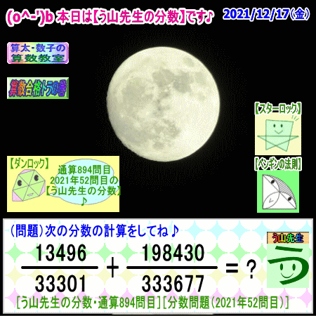 [う山雄一先生の分数]【分数894問目】算数・数学天才問題[2021年12月17日]Fraction □──────────────────□ 【算太・数子の算数教室】(R) 【算数合格トラの巻】 【う山TV(スタディ)】 【う山TV(バラエティ)】 【カンブリア・アカデミー】 □──────────────────□ (o^-')b 大人気☆[う山先生式・分数計算]の問題です♪ □──────────────────□ □ 2021/12/17(金曜) □ (o^-')b 【う山先生の分数・通算894問目】 [分数問題(2021年52問目)] 本日は2021年12月17日です。 次の分数計算をしてね♪ 13496/33301 + 198430/333677 = ? 【答え】後程♪ □ □──────────────────□ (*^ー^)ノ 本日も面白い分数問題を作りました☆ 分子・分母ともどうなるかな♪ □ [Fraction of Professor Uyama] доля Frakcja Fracao □──────────────────□ 算数・数学・家庭教師・個別指導・質問教室 □──────────────────□ □□□□□□□□□□□□□□□□□□□□ #分数 #う山先生の分数 #算数 #算数合格トラの巻 #数学 #解けたら天才 #家庭教師 #う山TV #う山先生 #う山雄一先生 #算太数子の算数教室 #算太数子 #算太くん #数子ちゃん #オルドビスキー博士 #シルルちゃん #デボン君 #白亜紀先生 #カンブリアアカデミー #勉強 #勉強垢 #計算問題 #数学垢 #数学教えて #数学教える #中学受験 #中学入試 #高校入試 #高校受験 #相互フォロー □ □□□□□□□□□□□□□□□□□□□□ [発行者氏名]【う山雄一】 [発行者web]【算数合格トラの巻】 [発行者web]【算太・数子の算数教室】(R) [著作]【算太・数子の算数教室】(R) 「さんた・かずこのさんすうきょうしつ」 [著作]【算遊記】 □ [メインサイト]う山先生のHP https://uyama.theblog.me/ □ [中学受験・算数]メイン http://uyama.aikotoba.jp/ [中学受験・算数]サブ https://sansu.theblog.me/ http://santakazuko.wix.com/uyama □ [成績表・偏差値アップ] http://uyama.aikotoba.jp/seiseki/seiseki.html □ [算遊記(さんゆうき)]算蔵法師・算悟空 http://www.geocities.jp/san_yu_ki/(←工事中) □ [仕事用フェイスブック] https://www.facebook.com/kazuko.santa.5/ □ [全般メール] ??????@gmail.com □ [中学受験・仕事用メール] ??????@gmail.com □ [ブログ]【算数合格トラの巻】 http://ameblo.jp/sansu/ http://uyama.blog.jp/ https://blog.goo.ne.jp/sansu_gokaku □ [ブログ]【算太・数子の算数教室】(R) http://ameblo.jp/santa-kazuko/ http://blog.goo.ne.jp/santa_kazuko http://santakazuko.wordpress.com/ http://santa-kazuko.at.webry.info/ http://santa-kazuko.blogspot.jp/ http://ch.nicovideo.jp/santa-kazuko http://santa-kazuko.blog.jp/ □ [ブログ]【う山先生】 http://happy.ap.teacup.com/uyama/ http://sansugokaku.blog.fc2.com/ https://uyama-sensei.hatenablog.com/ □ [ブログ]【オルドビスキー博士】 http://ameblo.jp/ordovisky/ □ [ブログ]【う山TV】 https://ameblo.jp/uyama-tv/ □ [動画一覧]【う山TV】(スタディ/バラエティ) http://uyama.aikotoba.jp/3-uyama-tv.html □ [動画一覧]【う山TV】 https://uyama-tv.themedia.jp/ □ [作曲一覧]【う山TV】(作曲) https://uyama-tv.amebaownd.com/ □ [分数、楽しい!]シリーズ [分数で算数・数学の天才になろう♪]シリーズ [知的ゲーム]シリーズ [一瞬で解こう!]シリーズ [解けたら天才♪]シリーズ [家庭教師]シリーズ [算数・面白い問題]シリーズ [算数・数学ファイル/SSファイル]シリーズ 【音楽・作曲】シリーズ 【空耳】シリーズ 【恋愛探偵サララ】シリーズ 【ランキング】シリーズ □ □ 【毎日の問題ブログ】一覧(お好きなブログを登録してね♪) http://uyama.aikotoba.jp/2-blog.html □ □□□□□□□□□□□□□□□□□□□□ ☆ ☆ ☆ ☆ ☆ ☆ ☆ ☆ ☆ ☆ ☆