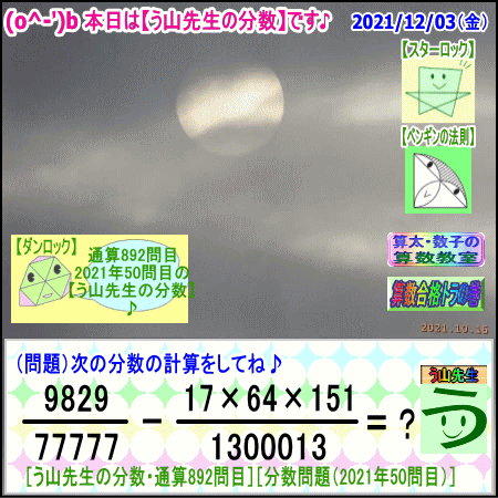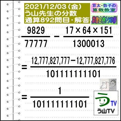 [う山雄一先生の分数]【分数892問目】算数・数学天才問題[2021年12月3日]Fraction □──────────────────□ 【算太・数子の算数教室】(R) 【算数合格トラの巻】 【う山TV(スタディ)】 【う山TV(バラエティ)】 【カンブリア・アカデミー】 □──────────────────□ (o^-')b 大人気☆[う山先生式・分数計算]の問題です♪ □──────────────────□ □ 2021/12/03(金曜) □ (o^-')b 【う山先生の分数・通算892問目】 [分数問題(2021年50問目)] 本日は2021年12月03日です。 次の分数計算をしてね♪ 9829/77777 -(17×64×151)/1300013 = ? 【答え】後程♪ □ □──────────────────□ (*^ー^)ノ 本日も面白い分数問題を作りました☆ 分子・分母ともどうなるかな♪ 本日は、前回を思い出してもらいたい分数問題です☆ □ [Fraction of Professor Uyama] доля Frakcja Fracao □──────────────────□ 算数・数学・家庭教師・個別指導・質問教室 □──────────────────□ □□□□□□□□□□□□□□□□□□□□ #分数 #う山先生の分数 #算数 #算数合格トラの巻 #数学 #解けたら天才 #家庭教師 #う山TV #う山先生 #う山雄一先生 #算太数子の算数教室 #算太数子 #算太くん #数子ちゃん #オルドビスキー博士 #シルルちゃん #デボン君 #白亜紀先生 #カンブリアアカデミー #勉強 #勉強垢 #計算問題 #数学垢 #数学教えて #数学教える #中学受験 #中学入試 #高校入試 #高校受験 #相互フォロー □ □□□□□□□□□□□□□□□□□□□□ [発行者氏名]【う山雄一】 [発行者web]【算数合格トラの巻】 [発行者web]【算太・数子の算数教室】(R) [著作]【算太・数子の算数教室】(R) 「さんた・かずこのさんすうきょうしつ」 [著作]【算遊記】 □ [メインサイト]う山先生のHP https://uyama.theblog.me/ □ [中学受験・算数]メイン http://uyama.aikotoba.jp/ [中学受験・算数]サブ https://sansu.theblog.me/ http://santakazuko.wix.com/uyama □ [成績表・偏差値アップ] http://uyama.aikotoba.jp/seiseki/seiseki.html □ [算遊記(さんゆうき)]算蔵法師・算悟空 http://www.geocities.jp/san_yu_ki/(←工事中) □ [仕事用フェイスブック] https://www.facebook.com/kazuko.santa.5/ □ [全般メール] ??????@gmail.com □ [中学受験・仕事用メール] ??????@gmail.com □ [ブログ]【算数合格トラの巻】 http://ameblo.jp/sansu/ http://uyama.blog.jp/ https://blog.goo.ne.jp/sansu_gokaku □ [ブログ]【算太・数子の算数教室】(R) http://ameblo.jp/santa-kazuko/ http://blog.goo.ne.jp/santa_kazuko http://santakazuko.wordpress.com/ http://santa-kazuko.at.webry.info/ http://santa-kazuko.blogspot.jp/ http://ch.nicovideo.jp/santa-kazuko http://santa-kazuko.blog.jp/ □ [ブログ]【う山先生】 http://happy.ap.teacup.com/uyama/ http://sansugokaku.blog.fc2.com/ https://uyama-sensei.hatenablog.com/ □ [ブログ]【オルドビスキー博士】 http://ameblo.jp/ordovisky/ □ [ブログ]【う山TV】 https://ameblo.jp/uyama-tv/ □ [動画一覧]【う山TV】(スタディ/バラエティ) http://uyama.aikotoba.jp/3-uyama-tv.html □ [動画一覧]【う山TV】 https://uyama-tv.themedia.jp/ □ [作曲一覧]【う山TV】(作曲) https://uyama-tv.amebaownd.com/ □ [分数、楽しい!]シリーズ [分数で算数・数学の天才になろう♪]シリーズ [知的ゲーム]シリーズ [一瞬で解こう!]シリーズ [解けたら天才♪]シリーズ [家庭教師]シリーズ [算数・面白い問題]シリーズ [算数・数学ファイル/SSファイル]シリーズ 【音楽・作曲】シリーズ 【空耳】シリーズ 【恋愛探偵サララ】シリーズ 【ランキング】シリーズ □ □ 【毎日の問題ブログ】一覧(お好きなブログを登録してね♪) http://uyama.aikotoba.jp/2-blog.html □ □□□□□□□□□□□□□□□□□□□□ ☆ ☆ ☆ ☆ ☆ ☆ ☆ ☆ ☆ ☆ ☆