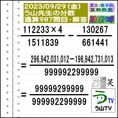 解答[う山先生の分数]【分数987問目】算数・数学天才問題[2023年9月29日出題]Fraction□──────────────────□【カンブリア・アカデミー】【算太・数子の算数教室】(R) 【算数合格トラの巻】【う山TV】(スタディ/バラエティ)□──────────────────□(o^-')b大人気☆[う山先生式・分数計算]の問題です♪[Fraction of Professor Uyama]□──────────────────□□2023/09/29(金曜)□(o^-')b【う山先生の分数・通算987問目】[分数問題(2023年39問目)]本日は2023年9月29日です。次の分数計算をしてね♪ (112233×4)/1511839 - 130267/661441 = ? □====================□♪( ´θ`)ノ【う山先生の分数・通算987問目】[分数問題(2023年39問目)]□【答え】[99999299999/999992299999]です。(分子=99999299999→11桁)(分母=999992299999→12桁)□(解法)(112233×4)/1511839 - 130267/661441=296,942,031,012/999992299999-196,942,731,013/999992299999=99999299999/999992299999□□====================□♪( ´θ`)ノ本日も面白い数字の分数を作成しました♪□分子は[9999992999999=9が5個+2が1個+9が5個→11桁]分母は[99999922999999=9が5個+2が2個+9が5個→12桁]です☆□本日は、[9・2]の面白い分数問題を作成しました☆□♪( ´ ▽ ` )ノもちろん、答えは既約分数です☆□□====================□(*^ー^)ノ[参考]□(1511839[7桁]=7×31×6967)(661441[6桁]=11×157×383)(448932[6桁]=2×2×3×11×19×179=112233×4)(130267[6桁]=素数)(99999299999[11桁]=205537×486527)(999992299999[12桁]=7×11×31×157×383×6967=661441×1511839)□□□──────────────────□#分数#う山先生の分数#算数#算数合格トラの巻#数学#解けたら天才#家庭教師#う山TV#う山先生#う山雄一先生#算太数子の算数教室#算太数子#算太くん#数子ちゃん #オルドビスキー博士#シルルちゃん#デボン君#白亜紀先生#カンブリアアカデミー#勉強#勉強垢#計算問題#数学垢#数学教えて#数学教える#中学受験#中学入試#高校入試#高校受験#相互フォロー□□□□□□□□□□□□□□[参考]【う山先生の分数】通算987問目[2013年]40問[2014年]135問[2015年]143問[2016年]131問[2017年]128問[2018年]108問[2019年]105問[2020年]52問[2021年]54問[2022年]52問□[2023年]2023/01/06(金)[1/2023]2023/01/13(金)[1/2023]2023/01/20(金)[1/2023]2023/01/27(金)[1/2023]2023/02/03(金)[76767676767/98989898989]2023/02/10(金)[87878787878/98989898989]2023/02/17(金)[2222222222/22222222221]2023/02/24(金)[2222222221/22222222221]2023/03/03(金)[33333333333/33333333335]2023/03/10(金)[33333333333/33333333353]□2023/03/17(金)[33333333333/33333335333]2023/03/24(金)[33333333333/33333353333]2023/03/31(金)[33333333333/33333533333]2023/04/07(金)[4444444444/4444444445]2023/04/14(金)[44444444444/44444444445]2023/04/21(金)[5555555555/44444544444]2023/04/28(金)[5555555555/54444444444]2023/05/05(金)[5555555555/53333333333]2023/05/12(金)[3333333333/53333333333]2023/05/19(金)[33333333333/53333333333]□2023/05/26(金)[33333333335/53333333333]2023/06/02(金)[1/66666666665]2023/06/09(金)[1/66666666665]2023/06/16(金)[55555555556/66666666665]2023/06/23(金)[55555555556/66666666665]2023/06/30(金)[44444444444/66666666665]2023/07/07(金)[1/777766665555]2023/07/14(金)[11111111111/777766665555]2023/07/21(金)[22222222222/777766665555]2023/07/28(金)[77777777777/777766665555]□2023/08/04(金)[1/77777773331]2023/08/11(金)[55555/77777773331]2023/08/18(金)[55555/77777773331]2023/08/25(金)[13337777777/77777773331]2023/09/01(金)[11111113337/77777773331]2023/09/08(金)[989898989/9898989898]2023/09/15(金)[989898989/9898989898]2023/09/22(金)[999929999/9999229999]2023/09/29(金)[99999299999/999992299999]←本日(o^-')b□□□□□□□□□□□□□□□□──────────────────□算数・数学・家庭教師・個別指導・質問教室□──────────────────□□□□□□□□□□□□□□□□□□□□□□[氏名]【う山雄一】[動画]【う山TV(スタディ)】[動画]【う山TV(バラエティ)】[著書]【算太・数子の算数教室】(R)□[メインサイト]【う山先生のHP】https://uyama.theblog.me/□□[成績表・偏差値アップ]http://uyama.aikotoba.jp/seiseki/seiseki.html□□[YouTube・チャンネル]【う山TV】(スタディ)https://www.youtube.com/channel/UCnMIEU_iFTH2iP5uAH1qevQ□□[YouTube・チャンネル]【う山TV】(バラエティ)https://www.youtube.com/channel/UC32D4Nf7sEpxD_VvoaHsJaA□□[全般メール]??????@gmail.com □[中学受験・仕事用メール]??????@gmail.com □□□□□□□□□□□□□□□□□□□□□□☆☆☆☆☆☆☆☆☆☆☆☆☆