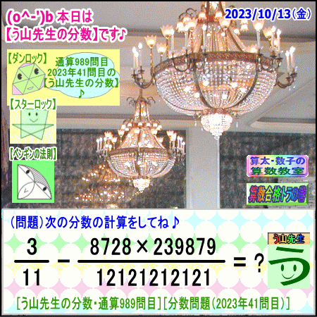 問題[う山雄一先生の分数]【分数989問目】算数・数学天才問題[2023年10月13日]Fraction□──────────────────□【算太・数子の算数教室】(R) 【算数合格トラの巻】【う山TV(スタディ)】【う山TV(バラエティ)】【カンブリア・アカデミー】□──────────────────□(o^-')b大人気☆[う山先生式・分数計算]の問題です♪□──────────────────□□2023/10/13(金曜)□(o^-')b【う山先生の分数・通算989問目】[分数問題(2023年41問目)]本日は2023年10月13日です。次の分数計算をしてね♪ 3/11 -(8728×239879)/12121212121 = ? 【答え】後程♪□□──────────────────□(*^ー^)ノ通算989問目です♪本日も面白い分数問題を作成しました☆分子・分母ともどうなるかな♪□[Fraction of Professor Uyama]доляFrakcjaFracao□──────────────────□算数・数学・家庭教師・個別指導・質問教室□──────────────────□□□□□□□□□□□□□□□□□□□□□#分数#う山先生の分数#算数#算数合格トラの巻#数学#解けたら天才#家庭教師#う山TV#う山先生#う山雄一先生#算太数子の算数教室#算太数子#算太くん#数子ちゃん #オルドビスキー博士#シルルちゃん#デボン君#白亜紀先生#カンブリアアカデミー#勉強#勉強垢#計算問題#数学垢#数学教えて#数学教える#中学受験#中学入試#高校入試#高校受験#相互フォロー□□□□□□□□□□□□□□□□□□□□□[氏名]【う山雄一】[動画]【う山TV(スタディ)】[動画]【う山TV(バラエティ)】[著書]【算太・数子の算数教室】(R)□[メインサイト]【う山先生のHP】https://uyama.theblog.me/□□[成績表・偏差値アップ]http://uyama.aikotoba.jp/seiseki/seiseki.html□□[YouTube・チャンネル]【う山TV】(スタディ)https://www.youtube.com/channel/UCnMIEU_iFTH2iP5uAH1qevQ□□[YouTube・チャンネル]【う山TV】(バラエティ)https://www.youtube.com/channel/UC32D4Nf7sEpxD_VvoaHsJaA□□[全般メール]??????@gmail.com □[中学受験・仕事用メール]??????@gmail.com □□□□□□□□□□□□□□□□□□□□□□☆☆☆☆☆☆☆☆☆☆☆☆☆