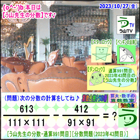 問題[う山雄一先生の分数]【分数991問目】算数・数学天才問題[2023年10月27日]Fraction□──────────────────□【算太・数子の算数教室】(R) 【算数合格トラの巻】【う山TV(スタディ)】【う山TV(バラエティ)】【カンブリア・アカデミー】□──────────────────□(o^-')b大人気☆[う山先生式・分数計算]の問題です♪□──────────────────□□2023/10/27(金曜)□(o^-')b【う山先生の分数・通算991問目】[分数問題(2023年43問目)]本日は2023年10月27日です。次の分数計算をしてね♪ 613/(111×111) - 412/(91×91) = ? 【答え】後程♪□□──────────────────□(*^ー^)ノ通算991問目です♪本日も面白い分数問題を作成しました☆分子・分母ともどうなるかな♪□[Fraction of Professor Uyama]доляFrakcjaFracao□──────────────────□算数・数学・家庭教師・個別指導・質問教室□──────────────────□□□□□□□□□□□□□□□□□□□□□#分数#う山先生の分数#算数#算数合格トラの巻#数学#解けたら天才#家庭教師#う山TV#う山先生#う山雄一先生#算太数子の算数教室#算太数子#算太くん#数子ちゃん #オルドビスキー博士#シルルちゃん#デボン君#白亜紀先生#カンブリアアカデミー#勉強#勉強垢#計算問題#数学垢#数学教えて#数学教える#中学受験#中学入試#高校入試#高校受験#相互フォロー□□□□□□□□□□□□□□□□□□□□□[氏名]【う山雄一】[動画]【う山TV(スタディ)】[動画]【う山TV(バラエティ)】[著書]【算太・数子の算数教室】(R)□[メインサイト]【う山先生のHP】https://uyama.theblog.me/□□[成績表・偏差値アップ]http://uyama.aikotoba.jp/seiseki/seiseki.html□□[YouTube・チャンネル]【う山TV】(スタディ)https://www.youtube.com/channel/UCnMIEU_iFTH2iP5uAH1qevQ□□[YouTube・チャンネル]【う山TV】(バラエティ)https://www.youtube.com/channel/UC32D4Nf7sEpxD_VvoaHsJaA□□[全般メール]??????@gmail.com □□[受験専用・仕事用メール]??????@gmail.com □□□□□□□□□□□□□□□□□□□□□□☆☆☆☆☆☆☆☆☆☆☆☆☆