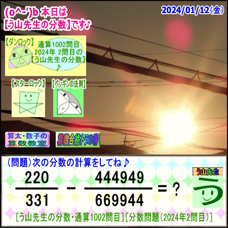 問題[う山雄一先生の分数]【分数1002問目】算数・数学天才問題[2024年1月12日] Fraction□──────────────────□【算太・数子の算数教室】(R) 【算数合格トラの巻】【う山TV(スタディ)】【う山TV(バラエティ)】【カンブリア・アカデミー】□──────────────────□(o^-')b大人気☆[う山先生式・分数計算]の問題です♪□──────────────────□□2024/01/12(金曜)□(o^-')b【う山先生の分数・通算1002問目】[分数問題(2024年 2問目)]本日は2024年1月12日です。次の分数計算をしてね♪ 220/331 - 444949/669944 = ? 【答え】後程♪□□──────────────────□(*^ー^)ノ通算1002問目です♪本日も面白い分数問題を作成しました☆分子・分母ともどうなるかな♪□[Fraction of Professor Uyama]доляFrakcjaFracao□──────────────────□算数・数学・家庭教師・個別指導・質問教室□──────────────────□□□□□□□□□□□□□□□□□□□□□#分数#う山先生の分数#算数#算数合格トラの巻#数学#解けたら天才#家庭教師#う山TV#う山先生#う山雄一先生#算太数子の算数教室#算太数子#算太くん#数子ちゃん #オルドビスキー博士#シルルちゃん#デボン君#白亜紀先生#カンブリアアカデミー#勉強#勉強垢#計算問題#数学垢#数学教えて#数学教える#中学受験#中学入試#高校入試#高校受験#相互フォロー□□□□□□□□□□□□□□□□□□□□□[氏名]【う山雄一】[動画]【う山TV(スタディ)】[動画]【う山TV(バラエティ)】[著書]【算太・数子の算数教室】(R)□[メインサイト]【う山先生のHP】https://uyama.theblog.me/□□[成績表・偏差値アップ]http://uyama.aikotoba.jp/seiseki/seiseki.html□□[YouTube・チャンネル]【う山TV】(スタディ)https://www.youtube.com/channel/UCnMIEU_iFTH2iP5uAH1qevQ□□[YouTube・チャンネル]【う山TV】(バラエティ)https://www.youtube.com/channel/UC32D4Nf7sEpxD_VvoaHsJaA□□[全般メール]??????@gmail.com □□[受験専用・仕事用メール]??????@gmail.com □□□□□□□□□□□□□□□□□□□□□□☆☆☆☆☆☆☆☆☆☆☆☆☆☆