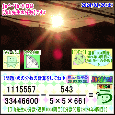 問題[う山雄一先生の分数]【分数1004問目】算数・数学天才問題[2024年1月26日] Fraction□──────────────────□【算太・数子の算数教室】(R) 【算数合格トラの巻】【う山TV(スタディ)】【う山TV(バラエティ)】【カンブリア・アカデミー】□──────────────────□(o^-')b大人気☆[う山先生式・分数計算]の問題です♪□──────────────────□□2024/01/26(金曜)□(o^-')b【う山先生の分数・通算1004問目】[分数問題(2024年 4問目)]本日は2024年1月26日です。次の分数計算をしてね♪ 1115557/33446600 - 543/(5×5×661) = ? 【答え】後程♪□□──────────────────□(*^ー^)ノ通算1004問目です♪本日も面白い分数問題を作成しました☆分子・分母ともどうなるかな♪□[Fraction of Professor Uyama]доляFrakcjaFracao□──────────────────□算数・数学・家庭教師・個別指導・質問教室□──────────────────□□□□□□□□□□□□□□□□□□□□□#分数#う山先生の分数#算数#算数合格トラの巻#数学#解けたら天才#家庭教師#う山TV#う山先生#う山雄一先生#算太数子の算数教室#算太数子#算太くん#数子ちゃん #オルドビスキー博士#シルルちゃん#デボン君#白亜紀先生#カンブリアアカデミー#勉強#勉強垢#計算問題#数学垢#数学教えて#数学教える#中学受験#中学入試#高校入試#高校受験#相互フォロー□□□□□□□□□□□□□□□□□□□□□[氏名]【う山雄一】[動画]【う山TV(スタディ)】[動画]【う山TV(バラエティ)】[著書]【算太・数子の算数教室】(R)□[メインサイト]【う山先生のHP】https://uyama.theblog.me/□□[成績表・偏差値アップ]http://uyama.aikotoba.jp/seiseki/seiseki.html□□[YouTube・チャンネル]【う山TV】(スタディ)https://www.youtube.com/channel/UCnMIEU_iFTH2iP5uAH1qevQ□□[YouTube・チャンネル]【う山TV】(バラエティ)https://www.youtube.com/channel/UC32D4Nf7sEpxD_VvoaHsJaA□□[全般メール]??????@gmail.com □□[受験専用・仕事用メール]??????@gmail.com □□□□□□□□□□□□□□□□□□□□□□☆☆☆☆☆☆☆☆☆☆☆☆☆☆