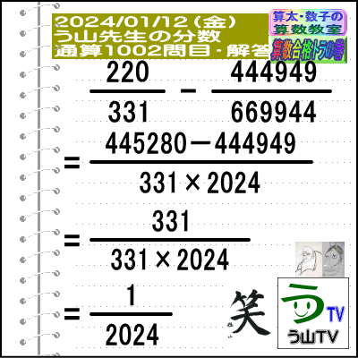 [う山先生の分数]【算数・数学】1002問目【う山先生からの挑戦状】[2024年1月12日出題]□──────────────────□(o^-')b【算数合格トラの巻】【算太・数子の算数教室】(R)【う山TV】【カンブリア・アカデミー】[Fraction of Professor Uyama]□──────────────────□□2024/01/12(金曜)□(o^-')b【う山先生の分数・通算1002問目】[分数問題(2024年 2問目)]本日は2024年1月12日です。次の分数計算をしてね♪ 220/331 - 444949/669944 = ? □□──────────────────□□(*^ー^)ノ今回も、4年生・5年生でも、頑張れば、楽しく解ける分数問題です☆[う山先生の分数]は、昨年2023年迄で、合計ちょうど【1000問】作りました☆今年も、わかりやすく通し番号(通算番号)と、その年の作成番号でいきます♪□本日も人気の【う山雄一先生の分数問題】です!楽しく解いてみて下さい♪(^^)□[YouTube]の【う山TV】の分数動画も参照してね☆□本日も、面白い分数問題を作成しました!分母・分子はどうなるかな?頑張って、5分以内で正解して下さい。『算数は面白い!』を実感してね♪(^0^)/ □[計算問題]を楽しんで解いて、【算数は面白い!で算数合格】しましょう☆(o^-')b□う山先生の予想正答率は、堂々と正解 → 30%以下頑張って正解 → 20%以下頑張ったけど惜しくも不正解 → 30%以下約分可能かどうか悩んで不正解 → 0.1%以下です。□ではレッツ・ゴー!!☆(^o^)/□答えは、 ↓ ↓ ↓ ↓ ↓ ↓ ↓ ↓ ↓□ ====================□♪( ´θ`)ノ【う山先生の分数・通算1002問目】[分数問題(2024年 2問目)]□【答え】[1/2024]です。(分子=1→1桁)(分母=2024→1桁)□(解法)220/331 - 444949/669944=445280/(331×2024)- 444949/(331×2024)=331/(331×2024)=1/2024□□====================□♪( ´θ`)ノ本日も面白い数字の分数を作成しました♪□分子は[1→1桁]分母は[2024=今年→4桁]です☆□本日も前回同様に、[2024]の面白い分数問題を作成しました☆□♪( ´ ▽ ` )ノもちろん、答えは既約分数です☆□□====================□(*^ー^)ノ[参考]□(220[3桁]=2×2×5×11)(331[3桁]=素数)(444949[6桁]=47×9467)(669944[6桁]=2×2×2×11×23×331=2024×331)(1[1桁])(2024[4桁]=2×2×2×11×23)□□□──────────────────□#分数#う山先生の分数#算数#算数合格トラの巻#数学#解けたら天才#家庭教師#う山TV#う山先生#う山雄一先生#算太数子の算数教室#算太数子#算太くん#数子ちゃん #オルドビスキー博士#シルルちゃん#デボン君#白亜紀先生#カンブリアアカデミー#勉強#勉強垢#計算問題#数学垢#数学教えて#数学教える#中学受験#中学入試#高校入試#高校受験#相互フォロー□□□□□□□□□□□□□□[参考]【う山先生の分数】通算1002問目[2013年]40問[2014年]135問[2015年]143問[2016年]131問[2017年]128問[2018年]108問[2019年]105問[2020年]52問[2021年]54問[2022年]52問[2023年]52問(通算1000問)□[2024年]2024/01/05(金)[1/2024]1001問目2024/01/12(金)[1/2024]1002問目←本日(o^-')b□□□□□□□□□□□□□□□□──────────────────□算数・数学・家庭教師・個別指導・質問教室□──────────────────□□□□□□□□□□□□□□□□□□□□□□[氏名]【う山雄一】[動画]【う山TV(スタディ)】[動画]【う山TV(バラエティ)】[著書]【算太・数子の算数教室】(R)□[メインサイト]【う山先生のHP】https://uyama.theblog.me/□□[成績表・偏差値アップ]http://uyama.aikotoba.jp/seiseki/seiseki.html□□[YouTube・チャンネル]【う山TV】(スタディ)https://www.youtube.com/channel/UCnMIEU_iFTH2iP5uAH1qevQ□□[YouTube・チャンネル]【う山TV】(バラエティ)https://www.youtube.com/channel/UC32D4Nf7sEpxD_VvoaHsJaA□□[全般メール]??????@gmail.com □□[受験専用・仕事用メール]??????@gmail.com □□□□□□□□□□□□□□□□□□□□□□☆☆☆☆☆☆☆☆☆☆☆☆☆☆