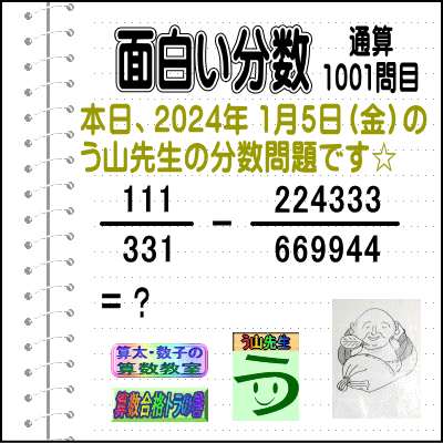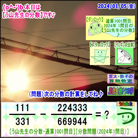 問題[う山雄一先生の分数]【分数1001問目】算数・数学天才問題[2024年1月5日] Fraction□──────────────────□【算太・数子の算数教室】(R) 【算数合格トラの巻】【う山TV(スタディ)】【う山TV(バラエティ)】【カンブリア・アカデミー】□──────────────────□(o^-')b大人気☆[う山先生式・分数計算]の問題です♪□──────────────────□□2024/01/05(金曜)□(o^-')b【う山先生の分数・通算1001問目】[分数問題(2024年 1問目)]本日は2024年1月5日です。次の分数計算をしてね♪ 111/331 - 224333/669944 = ? 【答え】後程♪□□──────────────────□(*^ー^)ノ通算1001問目です♪本日も面白い分数問題を作成しました☆分子・分母ともどうなるかな♪□[Fraction of Professor Uyama]доляFrakcjaFracao□──────────────────□算数・数学・家庭教師・個別指導・質問教室□──────────────────□□□□□□□□□□□□□□□□□□□□□#分数#う山先生の分数#算数#算数合格トラの巻#数学#解けたら天才#家庭教師#う山TV#う山先生#う山雄一先生#算太数子の算数教室#算太数子#算太くん#数子ちゃん #オルドビスキー博士#シルルちゃん#デボン君#白亜紀先生#カンブリアアカデミー#勉強#勉強垢#計算問題#数学垢#数学教えて#数学教える#中学受験#中学入試#高校入試#高校受験#相互フォロー□□□□□□□□□□□□□□□□□□□□□[氏名]【う山雄一】[動画]【う山TV(スタディ)】[動画]【う山TV(バラエティ)】[著書]【算太・数子の算数教室】(R)□[メインサイト]【う山先生のHP】https://uyama.theblog.me/□□[成績表・偏差値アップ]http://uyama.aikotoba.jp/seiseki/seiseki.html□□[YouTube・チャンネル]【う山TV】(スタディ)https://www.youtube.com/channel/UCnMIEU_iFTH2iP5uAH1qevQ□□[YouTube・チャンネル]【う山TV】(バラエティ)https://www.youtube.com/channel/UC32D4Nf7sEpxD_VvoaHsJaA□□[全般メール]??????@gmail.com □□[受験専用・仕事用メール]??????@gmail.com □□□□□□□□□□□□□□□□□□□□□□☆☆☆☆☆☆☆☆☆☆☆☆☆☆