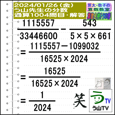 解答[う山先生の分数]【分数1004問目】算数・数学天才問題[2024年1月26日出題]Fraction□──────────────────□【カンブリア・アカデミー】【算太・数子の算数教室】(R) 【算数合格トラの巻】【う山TV】(スタディ/バラエティ)□──────────────────□(o^-')b大人気☆[う山先生式・分数計算]の問題です♪[Fraction of Professor Uyama]□──────────────────□□2024/01/26(金曜)□(o^-')b【う山先生の分数・通算1004問目】[分数問題(2024年 4問目)]本日は2024年1月26日です。次の分数計算をしてね♪ 1115557/33446600 - 543/(5×5×661) = ? □====================□♪( ´θ`)ノ【う山先生の分数・通算1004問目】[分数問題(2024年 4問目)]□【答え】[1/2024]です。(分子=1→1桁)(分母=2024→1桁)□(解法)1115557/33446600 - 543/(5×5×661) =1115557/(16525×2024)- 1099032/(16525×2024)=16525/(16525×2024)=1/2024□□====================□♪( ´θ`)ノ本日も面白い数字の分数を作成しました♪□分子は[1→1桁]分母は[2024=今年→4桁]です☆□本日も[2024]の面白い分数問題を作成しました☆パート4ですね♪□♪( ´ ▽ ` )ノもちろん、答えは既約分数です☆□□====================□(*^ー^)ノ[参考]□(1115557[7桁]=17×211×311)(33446600[8桁]=2×2×2×5×5×11×23×661=16525×2024)(543[3桁]=3×181)(16525[5桁]=5×5×661)(1[1桁])(2024[4桁]=2×2×2×11×23)□□□──────────────────□#分数#う山先生の分数#算数#算数合格トラの巻#数学#解けたら天才#家庭教師#う山TV#う山先生#う山雄一先生#算太数子の算数教室#算太数子#算太くん#数子ちゃん #オルドビスキー博士#シルルちゃん#デボン君#白亜紀先生#カンブリアアカデミー#勉強#勉強垢#計算問題#数学垢#数学教えて#数学教える#中学受験#中学入試#高校入試#高校受験#相互フォロー□□□□□□□□□□□□□□[参考]【う山先生の分数】通算1004問目[2013年]40問[2014年]135問[2015年]143問[2016年]131問[2017年]128問[2018年]108問[2019年]105問[2020年]52問[2021年]54問[2022年]52問[2023年]52問(通算1000問)□[2024年]2024/01/05(金)[1/2024]1001問目2024/01/12(金)[1/2024]1002問目2024/01/19(金)[1/2024]1003問目2024/01/26(金)[1/2024]1004問目←本日(o^-')b□□□□□□□□□□□□□□□□──────────────────□算数・数学・家庭教師・個別指導・質問教室□──────────────────□□□□□□□□□□□□□□□□□□□□□□[氏名]【う山雄一】[動画]【う山TV(スタディ)】[動画]【う山TV(バラエティ)】[著書]【算太・数子の算数教室】(R)□[メインサイト]【う山先生のHP】https://uyama.theblog.me/□□[成績表・偏差値アップ]http://uyama.aikotoba.jp/seiseki/seiseki.html□□[YouTube・チャンネル]【う山TV】(スタディ)https://www.youtube.com/channel/UCnMIEU_iFTH2iP5uAH1qevQ□□[YouTube・チャンネル]【う山TV】(バラエティ)https://www.youtube.com/channel/UC32D4Nf7sEpxD_VvoaHsJaA□□[全般メール]??????@gmail.com □□[受験専用・仕事用メール]??????@gmail.com □□□□□□□□□□□□□□□□□□□□□□☆☆☆☆☆☆☆☆☆☆☆☆☆☆