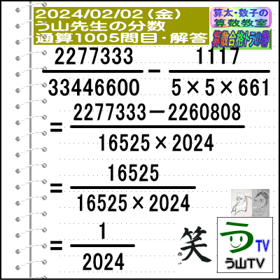 [う山先生の分数]【算数・数学】1005問目【う山先生からの挑戦状】[2024年2月2日出題]□──────────────────□(o^-')b【算数合格トラの巻】【算太・数子の算数教室】(R)【う山TV】【カンブリア・アカデミー】[Fraction of Professor Uyama]□──────────────────□□2024/02/02(金曜)□(o^-')b【う山先生の分数・通算1005問目】[分数問題(2024年 5問目)]本日は2024年2月2日です。次の分数計算をしてね♪ 2277333/33446600 - 1117/(5×5×661) = ? □□──────────────────□□(*^ー^)ノ今回も、4年生・5年生でも、頑張れば、楽しく解ける分数問題です☆[う山先生の分数]は、昨年2023年迄で、合計ちょうど【1000問】作りました☆今年も、わかりやすく通し番号(通算番号)と、その年の作成番号でいきます♪□本日も人気の【う山雄一先生の分数問題】です!楽しく解いてみて下さい♪(^^)□[YouTube]の【う山TV】の分数動画も参照してね☆□本日も、面白い分数問題を作成しました!分母・分子はどうなるかな?頑張って、5分以内で正解して下さい。『算数は面白い!』を実感してね♪(^0^)/ □[計算問題]を楽しんで解いて、【算数は面白い!で算数合格】しましょう☆(o^-')b□う山先生の予想正答率は、堂々と正解 → 30%以下頑張って正解 → 20%以下頑張ったけど惜しくも不正解 → 30%以下約分可能かどうか悩んで不正解 → 0.1%以下です。□ではレッツ・ゴー!!☆(^o^)/□答えは、 ↓ ↓ ↓ ↓ ↓ ↓ ↓ ↓ ↓□ ====================□♪( ´θ`)ノ【う山先生の分数・通算1005問目】[分数問題(2024年 5問目)]□【答え】[1/2024]です。(分子=1→1桁)(分母=2024→1桁)□(解法)2277333/33446600 - 1117/(5×5×661)=2277333/(16525×2024)- 2260808/(16525×2024)=16525/(16525×2024)=1/2024□□====================□♪( ´θ`)ノ本日も面白い数字の分数を作成しました♪□分子は[1→1桁]分母は[2024=今年→4桁]です☆□本日も[2024]の面白い分数問題を作成しました☆パート5ですね♪□♪( ´ ▽ ` )ノもちろん、答えは既約分数です☆□□====================□(*^ー^)ノ[参考]□(2277333[7桁]=3×3×79×3203)(33446600[8桁]=2×2×2×5×5×11×23×661=16525×2024)(1117[4桁]=素数)(16525[5桁]=5×5×661)(1[1桁])(2024[4桁]=2×2×2×11×23)□□□──────────────────□#分数#う山先生の分数#算数#算数合格トラの巻#数学#解けたら天才#家庭教師#う山TV#う山先生#う山雄一先生#算太数子の算数教室#算太数子#算太くん#数子ちゃん #オルドビスキー博士#シルルちゃん#デボン君#白亜紀先生#カンブリアアカデミー#勉強#勉強垢#計算問題#数学垢#数学教えて#数学教える#中学受験#中学入試#高校入試#高校受験#相互フォロー□□□□□□□□□□□□□□[参考]【う山先生の分数】通算1005問目[2013年]40問[2014年]135問[2015年]143問[2016年]131問[2017年]128問[2018年]108問[2019年]105問[2020年]52問[2021年]54問[2022年]52問[2023年]52問(通算1000問)□[2024年]2024/01/05(金)[1/2024]1001問目2024/01/12(金)[1/2024]1002問目2024/01/19(金)[1/2024]1003問目2024/01/26(金)[1/2024]1004問目2024/02/02(金)[1/2024]1005問目←本日(o^-')b□□□□□□□□□□□□□□□□──────────────────□算数・数学・家庭教師・個別指導・質問教室□──────────────────□□□□□□□□□□□□□□□□□□□□□□[氏名]【う山雄一】[動画]【う山TV(スタディ)】[動画]【う山TV(バラエティ)】[著書]【算太・数子の算数教室】(R)□[メインサイト]【う山先生のHP】https://uyama.theblog.me/□□[成績表・偏差値アップ]http://uyama.aikotoba.jp/seiseki/seiseki.html□□[YouTube・チャンネル]【う山TV】(スタディ)https://www.youtube.com/channel/UCnMIEU_iFTH2iP5uAH1qevQ□□[YouTube・チャンネル]【う山TV】(バラエティ)https://www.youtube.com/channel/UC32D4Nf7sEpxD_VvoaHsJaA□□[全般メール]??????@gmail.com □□[受験専用・仕事用メール]??????@gmail.com □□□□□□□□□□□□□□□□□□□□□□☆☆☆☆☆☆☆☆☆☆☆☆☆☆