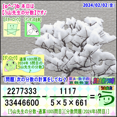 問題[う山雄一先生の分数]【分数1005問目】算数・数学天才問題[2024年2月2日] Fraction□──────────────────□【算太・数子の算数教室】(R) 【算数合格トラの巻】【う山TV(スタディ)】【う山TV(バラエティ)】【カンブリア・アカデミー】□──────────────────□(o^-')b大人気☆[う山先生式・分数計算]の問題です♪□──────────────────□□2024/02/02(金曜)□(o^-')b【う山先生の分数・通算1005問目】[分数問題(2024年 5問目)]本日は2024年2月2日です。次の分数計算をしてね♪ 2277333/33446600 - 1117/(5×5×661) = ? 【答え】後程♪□□──────────────────□(*^ー^)ノ通算1005問目です♪本日も面白い分数問題を作成しました☆分子・分母ともどうなるかな♪□[Fraction of Professor Uyama]доляFrakcjaFracao□──────────────────□算数・数学・家庭教師・個別指導・質問教室□──────────────────□□□□□□□□□□□□□□□□□□□□□#分数#う山先生の分数#算数#算数合格トラの巻#数学#解けたら天才#家庭教師#う山TV#う山先生#う山雄一先生#算太数子の算数教室#算太数子#算太くん#数子ちゃん #オルドビスキー博士#シルルちゃん#デボン君#白亜紀先生#カンブリアアカデミー#勉強#勉強垢#計算問題#数学垢#数学教えて#数学教える#中学受験#中学入試#高校入試#高校受験#相互フォロー□□□□□□□□□□□□□□□□□□□□□[氏名]【う山雄一】[動画]【う山TV(スタディ)】[動画]【う山TV(バラエティ)】[著書]【算太・数子の算数教室】(R)□[メインサイト]【う山先生のHP】https://uyama.theblog.me/□□[成績表・偏差値アップ]http://uyama.aikotoba.jp/seiseki/seiseki.html□□[YouTube・チャンネル]【う山TV】(スタディ)https://www.youtube.com/channel/UCnMIEU_iFTH2iP5uAH1qevQ□□[YouTube・チャンネル]【う山TV】(バラエティ)https://www.youtube.com/channel/UC32D4Nf7sEpxD_VvoaHsJaA□□[全般メール]??????@gmail.com □□[受験専用・仕事用メール]??????@gmail.com □□□□□□□□□□□□□□□□□□□□□□☆☆☆☆☆☆☆☆☆☆☆☆☆☆