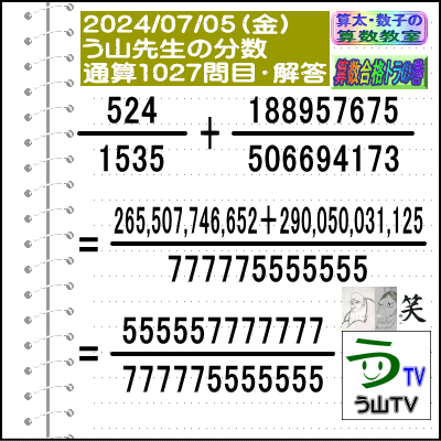 解答[う山先生の分数]【分数1027問目】算数・数学天才問題[2024年7月5日出題]Fraction□──────────────────□【カンブリア・アカデミー】【算太・数子の算数教室】(R) 【算数合格トラの巻】【う山TV】(スタディ/バラエティ)□──────────────────□(o^-')b大人気☆[う山先生式・分数計算]の問題です♪[Fraction of Professor Uyama]□──────────────────□□2024/07/05(金曜)□(o^-')b【う山先生の分数・通算1027問目】[分数問題(2024年27問目)]本日は2024年7月5日です。次の分数計算をしてね♪ 524/1535 + 188957675/5xxx-xxx-xxxxx = ? □====================□♪( ´θ`)ノ【う山先生の分数・通算1027問目】[分数問題(2024年27問目)]□【答え】[555557777777/777775555555]です。(分子=555557777777→12桁)(分母=777775555555→12桁)□(解法)524/1535 + 188957675/5xxx-xxx-xxxxx=265,507,746,652/777775555555 +290,050,031,125/777775555555=555557777777/777775555555□□====================□♪( ´θ`)ノ本日も面白い数字の分数を作成しました♪□分子は[555557777777=5が5個+7が7個→12桁]分母は[777775555555=7が5個+5が7個→12桁]です☆□本日は[7・5]の面白い分数問題を作成しました☆□♪( ´ ▽ ` )ノもちろん、答えは既約分数です☆□□====================□(*^ー^)ノ[参考]□(524[3桁]=2×2×131)(1535[4桁]=5×307)(188957675[9桁]=5×5×131×57697)(5xxx-xxx-xxxxx[9桁]=素数)(555557777777[12桁]=17×67×131×1193×3121)(777775555555[12桁]=5×307×5xxx-xxx-xxxxx)□□□──────────────────□#分数#う山先生の分数#算数#算数合格トラの巻#数学#解けたら天才#家庭教師#う山TV#う山先生#う山雄一先生#算太数子の算数教室#算太数子#算太くん#数子ちゃん #オルドビスキー博士#シルルちゃん#デボン君#白亜紀先生#カンブリアアカデミー#勉強#勉強垢#計算問題#数学垢#数学教えて#数学教える#中学受験#中学入試#高校入試#高校受験#相互フォロー□□□□□□□□□□□□□□□[参考]【う山先生の分数】通算1027問目[2013年]40問[2014年]135問[2015年]143問[2016年]131問[2017年]128問[2018年]108問[2019年]105問[2020年]52問[2021年]54問[2022年]52問[2023年]52問(通算1000問)□[2024年]2024/01/05(金)[1/2024]1001問目2024/01/12(金)[1/2024]1002問目2024/01/19(金)[1/2024]1003問目2024/01/26(金)[1/2024]1004問目2024/02/02(金)[1/2024]1005問目2024/02/09(金)[1/2024]1006問目2024/02/16(金)[1/2024]1007問目2024/02/23(金)[1/2024]1008問目2024/03/01(金)[131313131/313131313]1009問目2024/03/08(金)[227777777/33388888888]1010問目□2024/03/15(金)[22222222/222222223]1011問目2024/03/22(金)[22333/3332233322]1012問目2024/03/29(金)[33322/999999999]1013問目2024/04/05(金)[444455555/555544444]1014問目2024/04/12(金)[44444555555/55555444444]1015問目2024/04/19(金)[111111/333333322222]1016問目2024/04/26(金)[222222211111/333333322222]1017問目2024/05/03(金)[555555/666666644444]1018問目2024/05/10(金)[555555533333/666666644444]1019問目2024/05/17(金)[444444/555555533333]1020問目□2024/05/24(金)[55555533333/555555533333]1021問目2024/05/31(金)[333333355555/555555533333]1022問目2024/06/07(金)[55555/666666777777]1023問目2024/06/14(金)[555554444/666666777777]1024問目2024/06/21(金)[55555/666667777777]1025問目2024/06/28(金)[1111111/666666888888]1026問目2024/07/05(金)[555557777777/777775555555 1027問目←本日(o^-')b□ □□□□□□□□□□□□□□□──────────────────□算数・数学・家庭教師・個別指導・質問教室□──────────────────□□□□□□□□□□□□□□□□□□□□□□[氏名]【う山雄一】[動画]【う山TV(スタディ)】[動画]【う山TV(バラエティ)】[著書]【算太・数子の算数教室】(R)□[メインサイト]【う山先生のHP】https://uyama.theblog.me/□□[成績表・偏差値アップ]http://uyama.aikotoba.jp/seiseki/seiseki.html□□[YouTube・チャンネル]【う山TV】(スタディ)https://www.youtube.com/channel/UCnMIEU_iFTH2iP5uAH1qevQ□□[YouTube・チャンネル]【う山TV】(バラエティ)https://www.youtube.com/channel/UC32D4Nf7sEpxD_VvoaHsJaA□□[全般メール]??????@gmail.com □□[受験専用・仕事用メール]??????@gmail.com □□□□□□□□□□□□□□□□□□□□□□☆☆☆☆☆☆☆☆☆☆☆☆☆☆