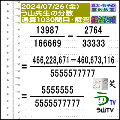 解答[う山先生の分数]【分数1030問目】算数・数学天才問題[2024年7月26日出題]Fraction□──────────────────□【カンブリア・アカデミー】【算太・数子の算数教室】(R) 【算数合格トラの巻】【う山TV】(スタディ/バラエティ)□──────────────────□(o^-')b大人気☆[う山先生式・分数計算]の問題です♪[Fraction of Professor Uyama]□──────────────────□□2024/07/26(金曜)□(o^-')b【う山先生の分数・通算1030問目】[分数問題(2024年30問目)]本日は2024年7月26日です。次の分数計算をしてね♪ 13987/166669 - 2764/33333 = ? □====================□♪( ´θ`)ノ【う山先生の分数・通算1030問目】[分数問題(2024年30問目)]□【答え】[5555555/5555577777]です。(分子=5555555→7桁)(分母=5555577777→10桁)□(解法)13987/166669 - 2764/33333=466,228,671/5555577777 -460,673,116/5555577777=5555555/5555577777□□====================□♪( ´θ`)ノ本日も面白い数字の分数を作成しました♪□分子は[5555555=5が7個→7桁]分母は[5555577777=5が5個+7が5個→10桁]です☆□本日は[5・7]の面白い分数問題を作成しました☆□♪( ´ ▽ ` )ノもちろん、答えは既約分数です☆□□====================□(*^ー^)ノ[参考]□(13987[5桁]=71×197)(166669[6桁]=素数)(2764[4桁]=2×2×691)(33333[5桁]=3×41×271)(5555555[7桁]=5×239×4649)(5555577777[10桁]=3×41×271×166669=33333×166669)□□□──────────────────□#分数#う山先生の分数#算数#算数合格トラの巻#数学#解けたら天才#家庭教師#う山TV#う山先生#う山雄一先生#算太数子の算数教室#算太数子#算太くん#数子ちゃん #オルドビスキー博士#シルルちゃん#デボン君#白亜紀先生#カンブリアアカデミー#勉強#勉強垢#計算問題#数学垢#数学教えて#数学教える#中学受験#中学入試#高校入試#高校受験#相互フォロー□□□□□□□□□□□□□□□[参考]【う山先生の分数】通算1030問目[2013年]40問[2014年]135問[2015年]143問[2016年]131問[2017年]128問[2018年]108問[2019年]105問[2020年]52問[2021年]54問[2022年]52問[2023年]52問(通算1000問)□[2024年]2024/01/05(金)[1/2024]1001問目2024/01/12(金)[1/2024]1002問目2024/01/19(金)[1/2024]1003問目2024/01/26(金)[1/2024]1004問目2024/02/02(金)[1/2024]1005問目2024/02/09(金)[1/2024]1006問目2024/02/16(金)[1/2024]1007問目2024/02/23(金)[1/2024]1008問目2024/03/01(金)[131313131/313131313]1009問目2024/03/08(金)[227777777/33388888888]1010問目□2024/03/15(金)[22222222/222222223]1011問目2024/03/22(金)[22333/3332233322]1012問目2024/03/29(金)[33322/999999999]1013問目2024/04/05(金)[444455555/555544444]1014問目2024/04/12(金)[44444555555/55555444444]1015問目2024/04/19(金)[111111/333333322222]1016問目2024/04/26(金)[222222211111/333333322222]1017問目2024/05/03(金)[555555/666666644444]1018問目2024/05/10(金)[555555533333/666666644444]1019問目2024/05/17(金)[444444/555555533333]1020問目□2024/05/24(金)[55555533333/555555533333]1021問目2024/05/31(金)[333333355555/555555533333]1022問目2024/06/07(金)[55555/666666777777]1023問目2024/06/14(金)[555554444/666666777777]1024問目2024/06/21(金)[55555/666667777777]1025問目2024/06/28(金)[1111111/666666888888]1026問目2024/07/05(金)[555557777777/777775555555] 1027問目2024/07/12(金)[11111111111/666666888888] 1028問目2024/07/19(金)[66666664/77777775] 1029問目2024/07/26(金)[5555555/5555577777] 1030問目←本日(o^-')b □ □□□□□□□□□□□□□□□──────────────────□算数・数学・家庭教師・個別指導・質問教室□──────────────────□□□□□□□□□□□□□□□□□□□□□□[氏名]【う山雄一】[動画]【う山TV(スタディ)】[動画]【う山TV(バラエティ)】[著書]【算太・数子の算数教室】(R)□[メインサイト]【う山先生のHP】https://uyama.theblog.me/□□[成績表・偏差値アップ]http://uyama.aikotoba.jp/seiseki/seiseki.html□□[YouTube・チャンネル]【う山TV】(スタディ)https://www.youtube.com/channel/UCnMIEU_iFTH2iP5uAH1qevQ□□[YouTube・チャンネル]【う山TV】(バラエティ)https://www.youtube.com/channel/UC32D4Nf7sEpxD_VvoaHsJaA□□[全般メール]??????@gmail.com □□[受験専用・仕事用メール]??????@gmail.com □□□□□□□□□□□□□□□□□□□□□□☆☆☆☆☆☆☆☆☆☆☆☆☆☆