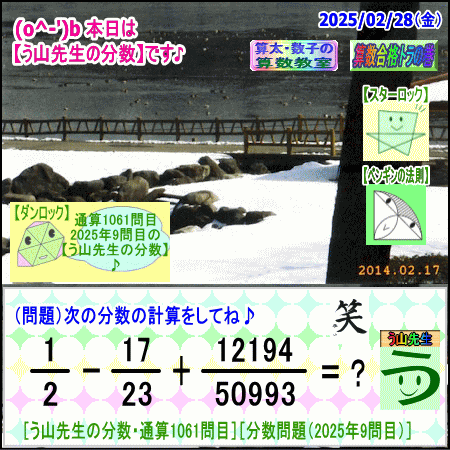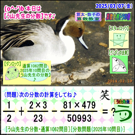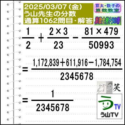問題[う山雄一先生の分数]【分数1062問目】算数・数学天才問題[2025年3月7日]Fraction□──────────────────□【算太・数子の算数教室】(R) 【算数合格トラの巻】【う山TV(スタディ)】【う山TV(バラエティ)】【カンブリア・アカデミー】□──────────────────□(o^-')b大人気☆[う山先生式・分数計算]の問題です♪□──────────────────□□2025/03/07(金曜)□(o^-')b【う山先生の分数・通算1062問目】[分数問題(2025年10問目)]本日は2025年3月7日です。次の分数計算をしてね♪ 1/2 +(2×3)/23 -(81×479)/50993 = ? 【答え】後程♪ □□──────────────────□(*^ー^)ノ通算1062問目です♪本日も面白い分数問題を作成しました☆分子・分母ともどうなるかな♪□[Fraction of Professor Uyama]доляFrakcjaFracao□──────────────────□算数・数学・家庭教師・個別指導・質問教室□──────────────────□□□□□□□□□□□□□□□□□□□□□#分数#う山先生の分数#算数#算数合格トラの巻#数学#解けたら天才#家庭教師#う山TV#う山先生#う山雄一先生#算太数子の算数教室#算太数子#算太くん#数子ちゃん #オルドビスキー博士#シルルちゃん#デボン君#白亜紀先生#カンブリアアカデミー#勉強#勉強垢#計算問題#数学垢#数学教えて#数学教える#中学受験#中学入試#高校入試#高校受験#相互フォロー□□□□□□□□□□□□□□□□□□□□□[氏名]【う山雄一】[動画]【う山TV(スタディ)】[動画]【う山TV(バラエティ)】[著書]【算太・数子の算数教室】(R)□[メインサイト]【う山先生のHP】https://uyama.theblog.me/□□[成績表・偏差値アップ]http://uyama.aikotoba.jp/seiseki/seiseki.html□□[YouTube・チャンネル]【う山TV】(スタディ)https://www.youtube.com/channel/UCnMIEU_iFTH2iP5uAH1qevQ□□[YouTube・チャンネル]【う山TV】(バラエティ)https://www.youtube.com/channel/UC32D4Nf7sEpxD_VvoaHsJaA□□[全般メール]??????@gmail.com □□[受験専用・仕事用メール]??????@gmail.com □□□□□□□□□□□□□□□□□□□□□□☆☆☆☆☆☆☆☆☆☆☆☆☆☆☆