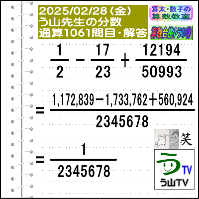 解答[う山先生の分数]【分数1061問目】算数・数学天才問題[2025年2月28日出題]Fraction□──────────────────□【カンブリア・アカデミー】【算太・数子の算数教室】(R) 【算数合格トラの巻】【う山TV】(スタディ/バラエティ)□──────────────────□(o^-')b大人気☆[う山先生式・分数計算]の問題です♪[Fraction of Professor Uyama]□──────────────────□□2025/02/28(金曜)□(o^-')b【う山先生の分数・通算1061問目】[分数問題(2025年9問目)]本日は2025年2月28日です。次の分数計算をしてね♪ 1/2 - 17/23 + 12194/50993 = ? □====================□♪( ´θ`)ノ【う山先生の分数・通算1061問目】[分数問題(2025年9問目)]□【答え】[1/2345678]です。(分子=1→1桁)(分母=2345678→7桁)□(解法)1/2 - 17/23 + 12194/50993=1,172,839/2345678-1,733,762/2345678+560,924/2345678=1/2345678□□====================□♪( ´θ`)ノ本日も面白い分数問題を作成しました☆□分子は[1→1桁]分母は[2345678→7桁]です☆□♪( ´ ▽ ` )ノもちろん、答えは既約分数です☆□□====================□(*^ー^)ノ[参考]□(2[1桁]=素数)(17[2桁]=素数)(23[2桁]=素数)(12194[5桁]=2×7×13×67)(50993[5桁]=素数)(2345678[7桁]=2×23×50993)□□□──────────────────□#分数#う山先生の分数#算数#算数合格トラの巻#数学#解けたら天才#家庭教師#う山TV#う山先生#う山雄一先生#算太数子の算数教室#算太数子#算太くん#数子ちゃん #オルドビスキー博士#シルルちゃん#デボン君#白亜紀先生#カンブリアアカデミー#勉強#勉強垢#計算問題#数学垢#数学教えて#数学教える#中学受験#中学入試#高校入試#高校受験#相互フォロー□□□□□□□□□□□□□□□□□[参考]【う山先生の分数】通算1061問目□[2013年]40問[2014年]135問[2015年]143問[2016年]131問[2017年]128問[2018年]108問[2019年]105問[2020年]52問[2021年]54問[2022年]52問[2023年]52問(通算1000問)[2024年]52問(通算1052問)□[2025年]2024/01/03(金)[1/2025]1053問目2024/01/10(金)[1/2025]1054問目2024/01/17(金)[1/2025]1055問目2024/01/24(金)[1/2025]1056問目2024/01/31(金)[1/2025]1057問目2024/02/07(金)[1/2025]1058問目2024/02/14(金)[2/3456789]1059問目2024/02/21(金)[1234567/3456789]1060問目2024/02/28(金)[1/2345678]1061問目←本日(o^-')b □ □□□□□□□□□□□□□□□□ □──────────────────□算数・数学・家庭教師・個別指導・質問教室□──────────────────□□□□□□□□□□□□□□□□□□□□□□[氏名]【う山雄一】[動画]【う山TV(スタディ)】[動画]【う山TV(バラエティ)】[著書]【算太・数子の算数教室】(R)□[メインサイト]【う山先生のHP】https://uyama.theblog.me/□□[成績表・偏差値アップ]http://uyama.aikotoba.jp/seiseki/seiseki.html□□[YouTube・チャンネル]【う山TV】(スタディ)https://www.youtube.com/channel/UCnMIEU_iFTH2iP5uAH1qevQ□□[YouTube・チャンネル]【う山TV】(バラエティ)https://www.youtube.com/channel/UC32D4Nf7sEpxD_VvoaHsJaA□□[全般メール]??????@gmail.com □□[受験専用・仕事用メール]??????@gmail.com □□□□□□□□□□□□□□□□□□□□□□☆☆☆☆☆☆☆☆☆☆☆☆☆☆☆