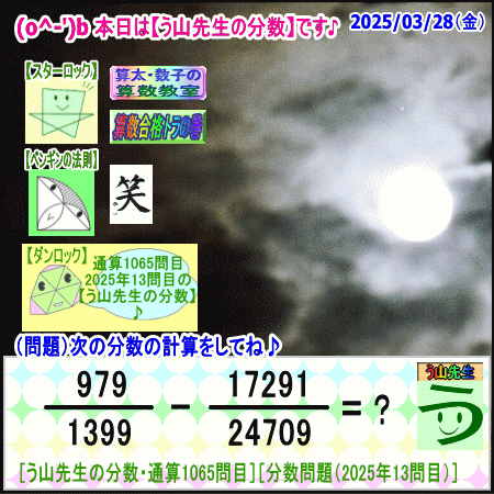 問題[う山雄一先生の分数]【分数1065問目】算数・数学天才問題[2025年3月28日]Fraction□──────────────────□【算太・数子の算数教室】(R) 【算数合格トラの巻】【う山TV(スタディ)】【う山TV(バラエティ)】【カンブリア・アカデミー】□──────────────────□(o^-')b大人気☆[う山先生式・分数計算]の問題です♪□──────────────────□□2025/03/28(金曜)□(o^-')b【う山先生の分数・通算1065問目】[分数問題(2025年13問目)]本日は2025年3月28日です。次の分数計算をしてね♪ 979/1399 - 17291/24709 = ? 【答え】後程♪ □□──────────────────□(*^ー^)ノ通算1065問目です♪本日も面白い分数問題を作成しました☆分子・分母ともどうなるかな♪□[Fraction of Professor Uyama]доляFrakcjaFracao□──────────────────□算数・数学・家庭教師・個別指導・質問教室□──────────────────□□□□□□□□□□□□□□□□□□□□□#分数#う山先生の分数#算数#算数合格トラの巻#数学#解けたら天才#家庭教師#う山TV#う山先生#う山雄一先生#算太数子の算数教室#算太数子#算太くん#数子ちゃん #オルドビスキー博士#シルルちゃん#デボン君#白亜紀先生#カンブリアアカデミー#勉強#勉強垢#計算問題#数学垢#数学教えて#数学教える#中学受験#中学入試#高校入試#高校受験#相互フォロー□□□□□□□□□□□□□□□□□□□□□[氏名]【う山雄一】[動画]【う山TV(スタディ)】[動画]【う山TV(バラエティ)】[著書]【算太・数子の算数教室】(R)□[メインサイト]【う山先生のHP】https://uyama.theblog.me/□□[成績表・偏差値アップ]http://uyama.aikotoba.jp/seiseki/seiseki.html□□[YouTube・チャンネル]【う山TV】(スタディ)https://www.youtube.com/channel/UCnMIEU_iFTH2iP5uAH1qevQ□□[YouTube・チャンネル]【う山TV】(バラエティ)https://www.youtube.com/channel/UC32D4Nf7sEpxD_VvoaHsJaA□□[全般メール]??????@gmail.com □□[受験専用・仕事用メール]??????@gmail.com □□□□□□□□□□□□□□□□□□□□□□☆☆☆☆☆☆☆☆☆☆☆☆☆☆☆