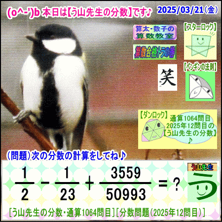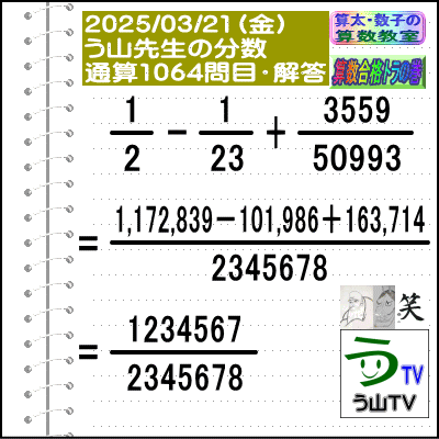 問題[う山雄一先生の分数]【分数1064問目】算数・数学天才問題[2025年3月21日]Fraction□──────────────────□【算太・数子の算数教室】(R) 【算数合格トラの巻】【う山TV(スタディ)】【う山TV(バラエティ)】【カンブリア・アカデミー】□──────────────────□(o^-')b大人気☆[う山先生式・分数計算]の問題です♪□──────────────────□□2025/03/21(金曜)□(o^-')b【う山先生の分数・通算1064問目】[分数問題(2025年12問目)]本日は2025年3月21日です。次の分数計算をしてね♪ 1/2 - 1/23 + 3559/50993 = ? 【答え】後程♪ □□──────────────────□(*^ー^)ノ通算1064問目です♪本日も面白い分数問題を作成しました☆分子・分母ともどうなるかな♪□[Fraction of Professor Uyama]доляFrakcjaFracao□──────────────────□算数・数学・家庭教師・個別指導・質問教室□──────────────────□□□□□□□□□□□□□□□□□□□□□#分数#う山先生の分数#算数#算数合格トラの巻#数学#解けたら天才#家庭教師#う山TV#う山先生#う山雄一先生#算太数子の算数教室#算太数子#算太くん#数子ちゃん #オルドビスキー博士#シルルちゃん#デボン君#白亜紀先生#カンブリアアカデミー#勉強#勉強垢#計算問題#数学垢#数学教えて#数学教える#中学受験#中学入試#高校入試#高校受験#相互フォロー□□□□□□□□□□□□□□□□□□□□□[氏名]【う山雄一】[動画]【う山TV(スタディ)】[動画]【う山TV(バラエティ)】[著書]【算太・数子の算数教室】(R)□[メインサイト]【う山先生のHP】https://uyama.theblog.me/□□[成績表・偏差値アップ]http://uyama.aikotoba.jp/seiseki/seiseki.html□□[YouTube・チャンネル]【う山TV】(スタディ)https://www.youtube.com/channel/UCnMIEU_iFTH2iP5uAH1qevQ□□[YouTube・チャンネル]【う山TV】(バラエティ)https://www.youtube.com/channel/UC32D4Nf7sEpxD_VvoaHsJaA□□[全般メール]??????@gmail.com □□[受験専用・仕事用メール]??????@gmail.com □□□□□□□□□□□□□□□□□□□□□□☆☆☆☆☆☆☆☆☆☆☆☆☆☆☆