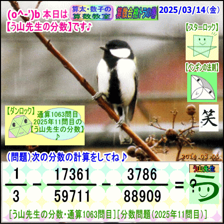 問題[う山雄一先生の分数]【分数1063問目】算数・数学天才問題[2025年3月14日]Fraction□──────────────────□【算太・数子の算数教室】(R) 【算数合格トラの巻】【う山TV(スタディ)】【う山TV(バラエティ)】【カンブリア・アカデミー】□──────────────────□(o^-')b大人気☆[う山先生式・分数計算]の問題です♪□──────────────────□□2025/03/14(金曜)円周率の日 □(o^-')b【う山先生の分数・通算1063問目】[分数問題(2025年11問目)]本日は2025年3月14日です。次の分数計算をしてね♪ 1/3 - 17361/59711 - 3786/88909 = ? 【答え】後程♪ □□──────────────────□(*^ー^)ノ通算1063問目です♪本日は「3月14日」=「円周率の日」ですね♪本日も面白い分数問題を作成しました☆分子・分母ともどうなるかな♪□[Fraction of Professor Uyama]доляFrakcjaFracao□──────────────────□算数・数学・家庭教師・個別指導・質問教室□──────────────────□□□□□□□□□□□□□□□□□□□□□#分数#う山先生の分数#算数#算数合格トラの巻#数学#解けたら天才#家庭教師#う山TV#う山先生#う山雄一先生#算太数子の算数教室#算太数子#算太くん#数子ちゃん #オルドビスキー博士#シルルちゃん#デボン君#白亜紀先生#カンブリアアカデミー#勉強#勉強垢#計算問題#数学垢#数学教えて#数学教える#中学受験#中学入試#高校入試#高校受験#相互フォロー□□□□□□□□□□□□□□□□□□□□□[氏名]【う山雄一】[動画]【う山TV(スタディ)】[動画]【う山TV(バラエティ)】[著書]【算太・数子の算数教室】(R)□[メインサイト]【う山先生のHP】https://uyama.theblog.me/□□[成績表・偏差値アップ]http://uyama.aikotoba.jp/seiseki/seiseki.html□□[YouTube・チャンネル]【う山TV】(スタディ)https://www.youtube.com/channel/UCnMIEU_iFTH2iP5uAH1qevQ□□[YouTube・チャンネル]【う山TV】(バラエティ)https://www.youtube.com/channel/UC32D4Nf7sEpxD_VvoaHsJaA□□[全般メール]??????@gmail.com □□[受験専用・仕事用メール]??????@gmail.com □□□□□□□□□□□□□□□□□□□□□□☆☆☆☆☆☆☆☆☆☆☆☆☆☆☆