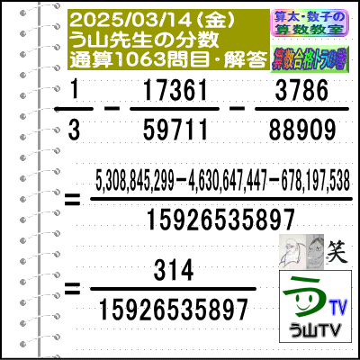 解答[う山先生の分数]【分数1063問目】算数・数学天才問題[2025年3月14日出題]Fraction□──────────────────□【カンブリア・アカデミー】【算太・数子の算数教室】(R) 【算数合格トラの巻】【う山TV】(スタディ/バラエティ)□──────────────────□(o^-')b大人気☆[う山先生式・分数計算]の問題です♪[Fraction of Professor Uyama]□──────────────────□□2025/03/14(金曜)円周率の日 □(o^-')b【う山先生の分数・通算1063問目】[分数問題(2025年11問目)]本日は2025年3月14日です。次の分数計算をしてね♪ 1/3 - 17361/59711 - 3786/88909 = ? □====================□♪( ´θ`)ノ【う山先生の分数・通算1063問目】[分数問題(2025年11問目)]□【答え】[314/15926535897]です。(分子=314→3桁)(分母=15926535897→11桁)□(解法)1/3 - 17361/59711 - 3786/88909=5,308,845,299/15926535897 -4,630,647,447/15926535897 -678,197,538/15926535897=314/15926535897□□====================□♪( ´θ`)ノ本日も面白い分数問題を作成しました☆円周率=3.1415926535897・・・を分数問題にしてみました♪□分子は[314→3桁]分母は[15926535897→11桁]です☆□♪( ´ ▽ ` )ノもちろん、答えは既約分数です☆□□====================□(*^ー^)ノ[参考]□(3[1桁]=素数)(17361[5桁]=3×3×3×643)(59711[5桁]=29×29×71)(3786[4桁]=2×3×631)(88909[5桁]=67×1327)(314[3桁]=2×157)(15926535897[11桁]=3×29×29×67×71×1327=3×59711×88909)□□□──────────────────□#分数#う山先生の分数#算数#算数合格トラの巻#数学#解けたら天才#家庭教師#う山TV#う山先生#う山雄一先生#算太数子の算数教室#算太数子#算太くん#数子ちゃん #オルドビスキー博士#シルルちゃん#デボン君#白亜紀先生#カンブリアアカデミー#勉強#勉強垢#計算問題#数学垢#数学教えて#数学教える#中学受験#中学入試#高校入試#高校受験#相互フォロー□□□□□□□□□□□□□□□□□[参考]【う山先生の分数】通算1063問目□[2013年]40問[2014年]135問[2015年]143問[2016年]131問[2017年]128問[2018年]108問[2019年]105問[2020年]52問[2021年]54問[2022年]52問[2023年]52問(通算1000問)[2024年]52問(通算1052問)□[2025年]2024/01/03(金)[1/2025]1053問目2024/01/10(金)[1/2025]1054問目2024/01/17(金)[1/2025]1055問目2024/01/24(金)[1/2025]1056問目2024/01/31(金)[1/2025]1057問目2024/02/07(金)[1/2025]1058問目2024/02/14(金)[2/3456789]1059問目2024/02/21(金)[1234567/3456789]1060問目2024/02/28(金)[1/2345678]1061問目2024/03/07(金)[1/2345678]1062問目□ 2024/03/14(金)[314/15926535897]1063問目←本日(o^-')b □ □□□□□□□□□□□□□□□□ □──────────────────□算数・数学・家庭教師・個別指導・質問教室□──────────────────□□□□□□□□□□□□□□□□□□□□□□[氏名]【う山雄一】[動画]【う山TV(スタディ)】[動画]【う山TV(バラエティ)】[著書]【算太・数子の算数教室】(R)□[メインサイト]【う山先生のHP】https://uyama.theblog.me/□□[成績表・偏差値アップ]http://uyama.aikotoba.jp/seiseki/seiseki.html□□[YouTube・チャンネル]【う山TV】(スタディ)https://www.youtube.com/channel/UCnMIEU_iFTH2iP5uAH1qevQ□□[YouTube・チャンネル]【う山TV】(バラエティ)https://www.youtube.com/channel/UC32D4Nf7sEpxD_VvoaHsJaA□□[全般メール]??????@gmail.com □□[受験専用・仕事用メール]??????@gmail.com □□□□□□□□□□□□□□□□□□□□□□☆☆☆☆☆☆☆☆☆☆☆☆☆☆☆