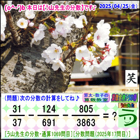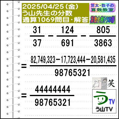 問題[う山雄一先生の分数]【分数1069問目】算数・数学天才問題[2025年4月25日]Fraction□──────────────────□【算太・数子の算数教室】(R) 【算数合格トラの巻】【う山TV(スタディ)】【う山TV(バラエティ)】【カンブリア・アカデミー】□──────────────────□(o^-')b大人気☆[う山先生式・分数計算]の問題です♪□──────────────────□□2025/04/25(金曜)□(o^-')b【う山先生の分数・通算1069問目】[分数問題(2025年17問目)]本日は2025年4月25日です。次の分数計算をしてね♪ 31/37 - 124/691 - 805/3863 =? 【答え】後程♪ □□──────────────────□(*^ー^)ノ通算1069問目です♪本日も面白い分数問題を作成しました☆分子・分母ともどうなるかな♪□[Fraction of Professor Uyama]доляFrakcjaFracao□──────────────────□算数・数学・家庭教師・個別指導・質問教室□──────────────────□□□□□□□□□□□□□□□□□□□□□#分数#う山先生の分数#算数#算数合格トラの巻#数学#解けたら天才#家庭教師#う山TV#う山先生#う山雄一先生#算太数子の算数教室#算太数子#算太くん#数子ちゃん #オルドビスキー博士#シルルちゃん#デボン君#白亜紀先生#カンブリアアカデミー#勉強#勉強垢#計算問題#数学垢#数学教えて#数学教える#中学受験#中学入試#高校入試#高校受験#相互フォロー□□□□□□□□□□□□□□□□□□□□□[氏名]【う山雄一】[動画]【う山TV(スタディ)】[動画]【う山TV(バラエティ)】[著書]【算太・数子の算数教室】(R)□[メインサイト]【う山先生のHP】https://uyama.theblog.me/□□[成績表・偏差値アップ]http://uyama.aikotoba.jp/seiseki/seiseki.html□□[YouTube・チャンネル]【う山TV】(スタディ)https://www.youtube.com/channel/UCnMIEU_iFTH2iP5uAH1qevQ□□[YouTube・チャンネル]【う山TV】(バラエティ)https://www.youtube.com/channel/UC32D4Nf7sEpxD_VvoaHsJaA□□[全般メール]??????@gmail.com □□[受験専用・仕事用メール]??????@gmail.com □□□□□□□□□□□□□□□□□□□□□□☆☆☆☆☆☆☆☆☆☆☆☆☆☆☆