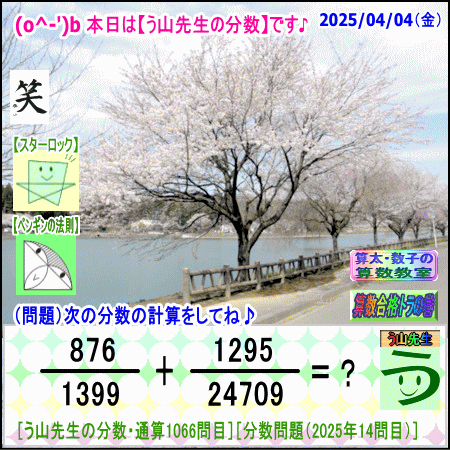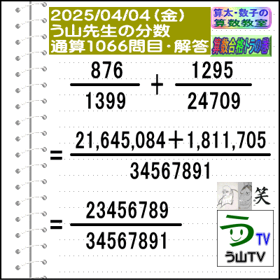 問題[う山雄一先生の分数]【分数1066問目】算数・数学天才問題[2025年4月4日]Fraction□──────────────────□【算太・数子の算数教室】(R) 【算数合格トラの巻】【う山TV(スタディ)】【う山TV(バラエティ)】【カンブリア・アカデミー】□──────────────────□(o^-')b大人気☆[う山先生式・分数計算]の問題です♪□──────────────────□□2025/04/04(金曜)□(o^-')b【う山先生の分数・通算1066問目】[分数問題(2025年14問目)]本日は2025年4月4日です。次の分数計算をしてね♪ 876/1399 + 1295/24709 = ? 【答え】後程♪ □□──────────────────□(*^ー^)ノ通算1066問目です♪本日も面白い分数問題を作成しました☆分子・分母ともどうなるかな♪□[Fraction of Professor Uyama]доляFrakcjaFracao□──────────────────□算数・数学・家庭教師・個別指導・質問教室□──────────────────□□□□□□□□□□□□□□□□□□□□□#分数#う山先生の分数#算数#算数合格トラの巻#数学#解けたら天才#家庭教師#う山TV#う山先生#う山雄一先生#算太数子の算数教室#算太数子#算太くん#数子ちゃん #オルドビスキー博士#シルルちゃん#デボン君#白亜紀先生#カンブリアアカデミー#勉強#勉強垢#計算問題#数学垢#数学教えて#数学教える#中学受験#中学入試#高校入試#高校受験#相互フォロー□□□□□□□□□□□□□□□□□□□□□[氏名]【う山雄一】[動画]【う山TV(スタディ)】[動画]【う山TV(バラエティ)】[著書]【算太・数子の算数教室】(R)□[メインサイト]【う山先生のHP】https://uyama.theblog.me/□□[成績表・偏差値アップ]http://uyama.aikotoba.jp/seiseki/seiseki.html□□[YouTube・チャンネル]【う山TV】(スタディ)https://www.youtube.com/channel/UCnMIEU_iFTH2iP5uAH1qevQ□□[YouTube・チャンネル]【う山TV】(バラエティ)https://www.youtube.com/channel/UC32D4Nf7sEpxD_VvoaHsJaA□□[全般メール]??????@gmail.com □□[受験専用・仕事用メール]??????@gmail.com □□□□□□□□□□□□□□□□□□□□□□☆☆☆☆☆☆☆☆☆☆☆☆☆☆☆