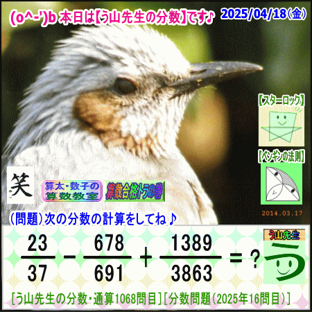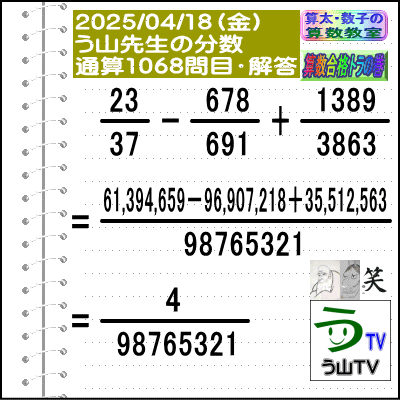 問題[う山雄一先生の分数]【分数1068問目】算数・数学天才問題[2025年4月18日]Fraction□──────────────────□【算太・数子の算数教室】(R) 【算数合格トラの巻】【う山TV(スタディ)】【う山TV(バラエティ)】【カンブリア・アカデミー】□──────────────────□(o^-')b大人気☆[う山先生式・分数計算]の問題です♪□──────────────────□□2025/04/18(金曜)□(o^-')b【う山先生の分数・通算1068問目】[分数問題(2025年16問目)]本日は2025年4月18日です。次の分数計算をしてね♪ 23/37 - 678/691 + 1389/3863 = ? 【答え】後程♪ □□──────────────────□(*^ー^)ノ通算1068問目です♪本日も面白い分数問題を作成しました☆分子・分母ともどうなるかな♪□[Fraction of Professor Uyama]доляFrakcjaFracao□──────────────────□算数・数学・家庭教師・個別指導・質問教室□──────────────────□□□□□□□□□□□□□□□□□□□□□#分数#う山先生の分数#算数#算数合格トラの巻#数学#解けたら天才#家庭教師#う山TV#う山先生#う山雄一先生#算太数子の算数教室#算太数子#算太くん#数子ちゃん #オルドビスキー博士#シルルちゃん#デボン君#白亜紀先生#カンブリアアカデミー#勉強#勉強垢#計算問題#数学垢#数学教えて#数学教える#中学受験#中学入試#高校入試#高校受験#相互フォロー□□□□□□□□□□□□□□□□□□□□□[氏名]【う山雄一】[動画]【う山TV(スタディ)】[動画]【う山TV(バラエティ)】[著書]【算太・数子の算数教室】(R)□[メインサイト]【う山先生のHP】https://uyama.theblog.me/□□[成績表・偏差値アップ]http://uyama.aikotoba.jp/seiseki/seiseki.html□□[YouTube・チャンネル]【う山TV】(スタディ)https://www.youtube.com/channel/UCnMIEU_iFTH2iP5uAH1qevQ□□[YouTube・チャンネル]【う山TV】(バラエティ)https://www.youtube.com/channel/UC32D4Nf7sEpxD_VvoaHsJaA□□[全般メール]??????@gmail.com □□[受験専用・仕事用メール]??????@gmail.com □□□□□□□□□□□□□□□□□□□□□□☆☆☆☆☆☆☆☆☆☆☆☆☆☆☆