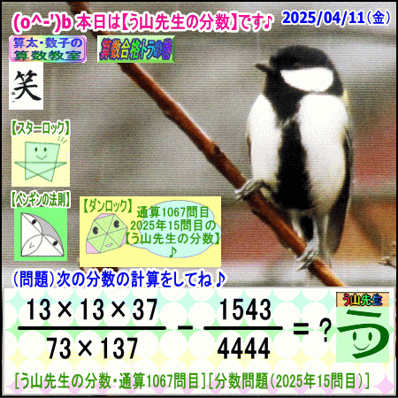 問題[う山雄一先生の分数]【分数1067問目】算数・数学天才問題[2025年4月11日]Fraction□──────────────────□【算太・数子の算数教室】(R) 【算数合格トラの巻】【う山TV(スタディ)】【う山TV(バラエティ)】【カンブリア・アカデミー】□──────────────────□(o^-')b大人気☆[う山先生式・分数計算]の問題です♪□──────────────────□□2025/04/11(金曜)□(o^-')b【う山先生の分数・通算1067問目】[分数問題(2025年15問目)]本日は2025年4月11日です。次の分数計算をしてね♪ (13×13×37)/(73×137) - 1543/4444 = ? 【答え】後程♪ □□──────────────────□(*^ー^)ノ通算1067問目です♪本日も面白い分数問題を作成しました☆分子・分母ともどうなるかな♪□[Fraction of Professor Uyama]доляFrakcjaFracao□──────────────────□算数・数学・家庭教師・個別指導・質問教室□──────────────────□□□□□□□□□□□□□□□□□□□□□#分数#う山先生の分数#算数#算数合格トラの巻#数学#解けたら天才#家庭教師#う山TV#う山先生#う山雄一先生#算太数子の算数教室#算太数子#算太くん#数子ちゃん #オルドビスキー博士#シルルちゃん#デボン君#白亜紀先生#カンブリアアカデミー#勉強#勉強垢#計算問題#数学垢#数学教えて#数学教える#中学受験#中学入試#高校入試#高校受験#相互フォロー□□□□□□□□□□□□□□□□□□□□□[氏名]【う山雄一】[動画]【う山TV(スタディ)】[動画]【う山TV(バラエティ)】[著書]【算太・数子の算数教室】(R)□[メインサイト]【う山先生のHP】https://uyama.theblog.me/□□[成績表・偏差値アップ]http://uyama.aikotoba.jp/seiseki/seiseki.html□□[YouTube・チャンネル]【う山TV】(スタディ)https://www.youtube.com/channel/UCnMIEU_iFTH2iP5uAH1qevQ□□[YouTube・チャンネル]【う山TV】(バラエティ)https://www.youtube.com/channel/UC32D4Nf7sEpxD_VvoaHsJaA□□[全般メール]??????@gmail.com □□[受験専用・仕事用メール]??????@gmail.com □□□□□□□□□□□□□□□□□□□□□□☆☆☆☆☆☆☆☆☆☆☆☆☆☆☆
