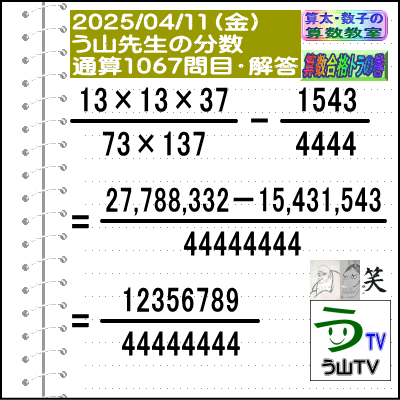 [う山先生の分数]【算数・数学】1067問目【う山先生からの挑戦状】[2025年4月11日出題]□──────────────────□(o^-')b【算数合格トラの巻】【算太・数子の算数教室】(R)【う山TV】【カンブリア・アカデミー】[Fraction of Professor Uyama]□──────────────────□□2025/04/11(金曜)□(o^-')b【う山先生の分数・通算1067問目】[分数問題(2025年15問目)]本日は2025年4月11日です。次の分数計算をしてね♪ (13×13×37)/(73×137) - 1543/4444 = ? □□──────────────────□□(*^ー^)ノ今回も、4年生・5年生でも、頑張れば、楽しく解ける分数問題です☆[う山先生の分数]は、2023年迄で合計【1000問】2024年迄で合計【1052問】作りました☆今年も、わかりやすく通し番号(通算番号)と、その年の作成番号でいきます♪□本日も人気の【う山雄一先生の分数問題】です!楽しく解いてみて下さい♪(^^)□[YouTube]の【う山TV】の分数動画も参照してね☆□本日も、面白い分数問題を作成しました!分母・分子はどうなるかな?頑張って、5分以内で正解して下さい。『算数は面白い!』を実感してね♪(^0^)/ □[計算問題]を楽しんで解いて、【算数は面白い!で算数合格】しましょう☆(o^-')b□う山先生の予想正答率は、堂々と正解 → 30%以下頑張って正解 → 20%以下頑張ったけど惜しくも不正解 → 30%以下約分可能かどうか悩んで不正解 → 20%以下です。□ではレッツ・ゴー!!☆(^o^)/□答えは、 ↓ ↓ ↓ ↓ ↓ ↓ ↓ ↓ ↓□ ====================□♪( ´θ`)ノ【う山先生の分数・通算1067問目】[分数問題(2025年15問目)]□【答え】[12356789/44444444]です。(分子=12356789→8桁)(分母=44444444→8桁)□(解法)(13×13×37)/(73×137) - 1543/4444=27,788,332/44444444-15,431,543/44444444=12356789/44444444□□====================□♪( ´θ`)ノ本日も面白い分数問題を作成しました☆□分子は[12356789→8桁](4なし)分母は[44444444→8桁]です☆□♪( ´ ▽ ` )ノもちろん、答えは既約分数です☆□□====================□(*^ー^)ノ[参考]□(6253[4桁]=13×13×37)(10001[5桁]=73×137)(1543[4桁]=素数)(4444[4桁]=2×2×11×101)(12356789[8桁]=素数)(44444444[8桁]=2×2×11×73×101×137=4444×10001)□□□──────────────────□#分数#う山先生の分数#算数#算数合格トラの巻#数学#解けたら天才#家庭教師#う山TV#う山先生#う山雄一先生#算太数子の算数教室#算太数子#算太くん#数子ちゃん #オルドビスキー博士#シルルちゃん#デボン君#白亜紀先生#カンブリアアカデミー#勉強#勉強垢#計算問題#数学垢#数学教えて#数学教える#中学受験#中学入試#高校入試#高校受験#相互フォロー□□□□□□□□□□□□□□□□□[参考]【う山先生の分数】通算1067問目□[2013年]40問[2014年]135問[2015年]143問[2016年]131問[2017年]128問[2018年]108問[2019年]105問[2020年]52問[2021年]54問[2022年]52問[2023年]52問(通算1000問)[2024年]52問(通算1052問)□[2025年]2024/01/03(金)[1/2025]1053問目2024/01/10(金)[1/2025]1054問目2024/01/17(金)[1/2025]1055問目2024/01/24(金)[1/2025]1056問目2024/01/31(金)[1/2025]1057問目2024/02/07(金)[1/2025]1058問目2024/02/14(金)[2/3456789]1059問目2024/02/21(金)[1234567/3456789]1060問目2024/02/28(金)[1/2345678]1061問目2024/03/07(金)[1/2345678]1062問目□ 2024/03/14(金)[314/15926535897]1063問目2024/03/21(金)[1234567/2345678]1064問目2024/03/28(金)[2/34567891]1065問目2024/04/04(金)[23456789/34567891]1066問目2024/04/11(金)[12356789/44444444]1067問目←本日(o^-')b □ □□□□□□□□□□□□□□□□□──────────────────□算数・数学・家庭教師・個別指導・質問教室□──────────────────□□□□□□□□□□□□□□□□□□□□□□[氏名]【う山雄一】[動画]【う山TV(スタディ)】[動画]【う山TV(バラエティ)】[著書]【算太・数子の算数教室】(R)□[メインサイト]【う山先生のHP】https://uyama.theblog.me/□□[成績表・偏差値アップ]http://uyama.aikotoba.jp/seiseki/seiseki.html□□[YouTube・チャンネル]【う山TV】(スタディ)https://www.youtube.com/channel/UCnMIEU_iFTH2iP5uAH1qevQ□□[YouTube・チャンネル]【う山TV】(バラエティ)https://www.youtube.com/channel/UC32D4Nf7sEpxD_VvoaHsJaA□□[全般メール]??????@gmail.com □□[受験専用・仕事用メール]??????@gmail.com □□□□□□□□□□□□□□□□□□□□□□☆☆☆☆☆☆☆☆☆☆☆☆☆☆☆