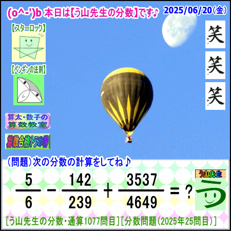 問題[う山雄一先生の分数]【分数1077問目】算数・数学天才問題[2025年6月20日]Fraction□──────────────────□【算太・数子の算数教室】(R) 【算数合格トラの巻】【う山TV(スタディ)】【う山TV(バラエティ)】【カンブリア・アカデミー】□──────────────────□(o^-')b大人気☆[う山先生式・分数計算]の問題です♪□──────────────────□□2025/06/20(金曜)□(o^-')b【う山先生の分数・通算1077問目】[分数問題(2025年25問目)]本日は2025年6月20日です。次の分数計算をしてね♪ 5/6 - 142/239 + 3537/4649 = ? 【答え】後程♪ □□──────────────────□(*^ー^)ノ通算1077問目です♪本日も面白い分数問題を作成しました☆分子・分母ともどうなるかな♪□[Fraction of Professor Uyama]доляFrakcjaFracao□──────────────────□算数・数学・家庭教師・個別指導・質問教室□──────────────────□□□□□□□□□□□□□□□□□□□□□#分数#う山先生の分数#算数#算数合格トラの巻#数学#解けたら天才#家庭教師#う山TV#う山先生#う山雄一先生#算太数子の算数教室#算太数子#算太くん#数子ちゃん #オルドビスキー博士#シルルちゃん#デボン君#白亜紀先生#カンブリアアカデミー#勉強#勉強垢#計算問題#数学垢#数学教えて#数学教える#中学受験#中学入試#高校入試#高校受験#相互フォロー□□□□□□□□□□□□□□□□□□□□□[氏名]【う山雄一】[動画]【う山TV(スタディ)】[動画]【う山TV(バラエティ)】[著書]【算太・数子の算数教室】(R)□[メインサイト]【う山先生のHP】https://uyama.theblog.me/□□[成績表・偏差値アップ]http://uyama.aikotoba.jp/seiseki/seiseki.html□□[YouTube・チャンネル]【う山TV】(スタディ)https://www.youtube.com/channel/UCnMIEU_iFTH2iP5uAH1qevQ□□[YouTube・チャンネル]【う山TV】(バラエティ)https://www.youtube.com/channel/UC32D4Nf7sEpxD_VvoaHsJaA□□[全般メール]??????@gmail.com □□[受験専用・仕事用メール]??????@gmail.com □□□□□□□□□□□□□□□□□□□□□□☆☆☆☆☆☆☆☆☆☆☆☆☆☆☆