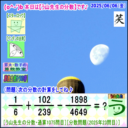 問題[う山雄一先生の分数]【分数1075問目】算数・数学天才問題[2025年6月6日]Fraction□──────────────────□【算太・数子の算数教室】(R) 【算数合格トラの巻】【う山TV(スタディ)】【う山TV(バラエティ)】【カンブリア・アカデミー】□──────────────────□(o^-')b大人気☆[う山先生式・分数計算]の問題です♪□──────────────────□□2025/06/06(金曜)□(o^-')b【う山先生の分数・通算1075問目】[分数問題(2025年23問目)]本日は2025年6月6日です。次の分数計算をしてね♪ 1/6 + 102/239 - 1898/4649 = ? 【答え】後程♪ □□──────────────────□(*^ー^)ノ通算1075問目です♪本日も面白い分数問題を作成しました☆分子・分母ともどうなるかな♪□[Fraction of Professor Uyama]доляFrakcjaFracao□──────────────────□算数・数学・家庭教師・個別指導・質問教室□──────────────────□□□□□□□□□□□□□□□□□□□□□#分数#う山先生の分数#算数#算数合格トラの巻#数学#解けたら天才#家庭教師#う山TV#う山先生#う山雄一先生#算太数子の算数教室#算太数子#算太くん#数子ちゃん #オルドビスキー博士#シルルちゃん#デボン君#白亜紀先生#カンブリアアカデミー#勉強#勉強垢#計算問題#数学垢#数学教えて#数学教える#中学受験#中学入試#高校入試#高校受験#相互フォロー□□□□□□□□□□□□□□□□□□□□□[氏名]【う山雄一】[動画]【う山TV(スタディ)】[動画]【う山TV(バラエティ)】[著書]【算太・数子の算数教室】(R)□[メインサイト]【う山先生のHP】https://uyama.theblog.me/□□[成績表・偏差値アップ]http://uyama.aikotoba.jp/seiseki/seiseki.html□□[YouTube・チャンネル]【う山TV】(スタディ)https://www.youtube.com/channel/UCnMIEU_iFTH2iP5uAH1qevQ□□[YouTube・チャンネル]【う山TV】(バラエティ)https://www.youtube.com/channel/UC32D4Nf7sEpxD_VvoaHsJaA□□[全般メール]??????@gmail.com □□[受験専用・仕事用メール]??????@gmail.com □□□□□□□□□□□□□□□□□□□□□□☆☆☆☆☆☆☆☆☆☆☆☆☆☆☆