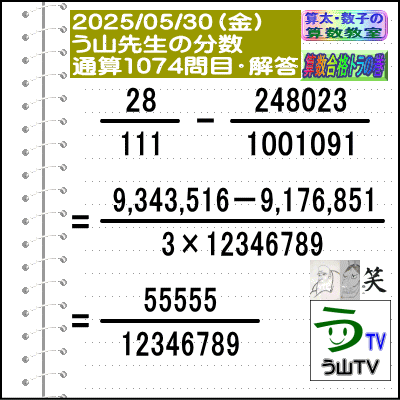 解答[う山先生の分数]【分数1074問目】算数・数学天才問題[2025年5月30日出題]Fraction□──────────────────□【カンブリア・アカデミー】【算太・数子の算数教室】(R) 【算数合格トラの巻】【う山TV】(スタディ/バラエティ)□──────────────────□(o^-')b大人気☆[う山先生式・分数計算]の問題です♪[Fraction of Professor Uyama]□──────────────────□□2025/05/30(金曜)□(o^-')b【う山先生の分数・通算1074問目】[分数問題(2025年22問目)]本日は2025年5月30日です。次の分数計算をしてね♪ 28/111 - 248023/1001091 =? □====================□♪( ´θ`)ノ【う山先生の分数・通算1074問目】[分数問題(2025年22問目)]□【答え】[55555/12346789]です。(分子=55555→5桁)(分母=12346789→8桁)□(解法)28/111 - 248023/1001091=9,343,516/37,040,367-9,176,851/37,040,367=166,665/37,040,367=(3×55555)/(3×12346789)=55555/12346789□□====================♪( ´θ`)ノ本日も面白い分数問題を作成しました☆□分子は[55555→5桁]分母は[12346789→8桁](5なし)です☆□♪( ´ ▽ ` )ノもちろん、答えは既約分数です☆□□(*'▽')↓こちらも見てね☆↓□※────────────────────※□♪( ´θ`)ノ【う山先生の分数・通算617問目】解答[分数問題(2018年-040)]□【答え】[5/12346789]です。(分子=5→1桁)(分母=12346789=5抜け→8桁)(5月に相応しい面白い分数問題を作りました☆)□(解法)(18×53)/3367 - 1039/3667=954/3367 - 1039/3667=3498318/12346789-3498313/12346789=5/12346789□※────────────────────※□====================□(*^ー^)ノ[参考]□(28[2桁]=2×2×7)(111[3桁]=3×37)(248023[6桁]=197×1259)(1001091[7桁]=3×7×13×19×193)(55555[5桁]=5×41×271)(12346789[8桁]=7×13×19×37×193)□□□──────────────────□#分数#う山先生の分数#算数#算数合格トラの巻#数学#解けたら天才#家庭教師#う山TV#う山先生#う山雄一先生#算太数子の算数教室#算太数子#算太くん#数子ちゃん #オルドビスキー博士#シルルちゃん#デボン君#白亜紀先生#カンブリアアカデミー#勉強#勉強垢#計算問題#数学垢#数学教えて#数学教える#中学受験#中学入試#高校入試#高校受験#相互フォロー□□□□□□□□□□□□□□□□□[参考]【う山先生の分数】通算1074問目□[2013年]40問[2014年]135問[2015年]143問[2016年]131問[2017年]128問[2018年]108問[2019年]105問[2020年]52問[2021年]54問[2022年]52問[2023年]52問(通算1000問)[2024年]52問(通算1052問)□[2025年]2025/01/03(金)[1/2025]1053問目2025/01/10(金)[1/2025]1054問目2025/01/17(金)[1/2025]1055問目2025/01/24(金)[1/2025]1056問目2025/01/31(金)[1/2025]1057問目2025/02/07(金)[1/2025]1058問目2025/02/14(金)[2/3456789]1059問目2025/02/21(金)[1234567/3456789]1060問目2025/02/28(金)[1/2345678]1061問目2025/03/07(金)[1/2345678]1062問目□ 2025/03/14(金)[314/15926535897]1063問目2025/03/21(金)[1234567/2345678]1064問目2025/03/28(金)[2/34567891]1065問目2025/04/04(金)[23456789/34567891]1066問目2025/04/11(金)[12356789/44444444]1067問目2025/04/18(金)[4/98765321]1068問目2025/04/25(金)[44444444/98765321]1069問目2025/05/02(金)[5/12346789]1070問目2025/05/09(金)[5/12346789]1071問目2025/05/16(金)[55555/12346789]1072問目□ 2025/05/23(金)[55555/12346789]1073問目2025/05/30(金)[55555/12346789]1074問目←本日(o^-')b □□□□□□□□□□□□□□□□□ □──────────────────□算数・数学・家庭教師・個別指導・質問教室□──────────────────□□□□□□□□□□□□□□□□□□□□□□[氏名]【う山雄一】[動画]【う山TV(スタディ)】[動画]【う山TV(バラエティ)】[著書]【算太・数子の算数教室】(R)□[メインサイト]【う山先生のHP】https://uyama.theblog.me/□□[成績表・偏差値アップ]http://uyama.aikotoba.jp/seiseki/seiseki.html□□[YouTube・チャンネル]【う山TV】(スタディ)https://www.youtube.com/channel/UCnMIEU_iFTH2iP5uAH1qevQ□□[YouTube・チャンネル]【う山TV】(バラエティ)https://www.youtube.com/channel/UC32D4Nf7sEpxD_VvoaHsJaA□□[全般メール]??????@gmail.com □□[受験専用・仕事用メール]??????@gmail.com □□□□□□□□□□□□□□□□□□□□□□☆☆☆☆☆☆☆☆☆☆☆☆☆☆☆