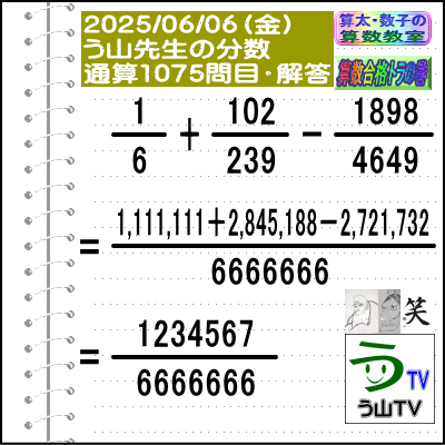 [う山先生の分数]【算数・数学】1075問目【う山先生からの挑戦状】[2025年6月6日出題]□──────────────────□(o^-')b【算数合格トラの巻】【算太・数子の算数教室】(R)【う山TV】【カンブリア・アカデミー】[Fraction of Professor Uyama]□──────────────────□□2025/06/06(金曜)□(o^-')b【う山先生の分数・通算1075問目】[分数問題(2025年23問目)]本日は2025年6月6日です。次の分数計算をしてね♪ 1/6 + 102/239 - 1898/4649 = ? □□──────────────────□□(*^ー^)ノ今回も、4年生・5年生でも、頑張れば、楽しく解ける分数問題です☆[う山先生の分数]は、2023年迄で合計【1000問】2024年迄で合計【1052問】作りました☆今年も、わかりやすく通し番号(通算番号)と、その年の作成番号でいきます♪□本日も人気の【う山雄一先生の分数問題】です!楽しく解いてみて下さい♪(^^)□[YouTube]の【う山TV】の分数動画も参照してね☆□本日も、面白い分数問題を作成しました!分母・分子はどうなるかな?頑張って、5分以内で正解して下さい。『算数は面白い!』を実感してね♪(^0^)/ □[計算問題]を楽しんで解いて、【算数は面白い!で算数合格】しましょう☆(o^-')b□う山先生の予想正答率は、堂々と正解 → 30%以下頑張って正解 → 20%以下頑張ったけど惜しくも不正解 → 30%以下約分可能かどうか悩んで不正解 → 15%以下です。□ではレッツ・ゴー!!☆(^o^)/□答えは、 ↓ ↓ ↓ ↓ ↓ ↓ ↓ ↓ ↓□ ====================□♪( ´θ`)ノ【う山先生の分数・通算1075問目】[分数問題(2025年23問目)]□【答え】[1234567/6666666]です。(分子=1234567→7桁)(分母=6666666→7桁)□(解法)1/6 + 102/239 - 1898/4649=1,111,111/6666666+2,845,188/6666666-2,721,732/6666666=1234567/6666666□□====================□♪( ´θ`)ノ本日も面白い分数問題を作成しました☆□分子は[1234567→7桁]分母は[6666666→7桁]です☆□♪( ´ ▽ ` )ノもちろん、答えは既約分数です☆□□====================□(*^ー^)ノ[参考]□(1[1桁])(6[1桁]=2×3)(102[桁]=2×3×17)(239[3桁]=素数)(1898[4桁]=2×13×73)(4649[4桁]=素数)(1234567[7桁]=127×9721)(6666666[7桁]=2×3×239×4649)□□□──────────────────□#分数#う山先生の分数#算数#算数合格トラの巻#数学#解けたら天才#家庭教師#う山TV#う山先生#う山雄一先生#算太数子の算数教室#算太数子#算太くん#数子ちゃん #オルドビスキー博士#シルルちゃん#デボン君#白亜紀先生#カンブリアアカデミー#勉強#勉強垢#計算問題#数学垢#数学教えて#数学教える#中学受験#中学入試#高校入試#高校受験#相互フォロー□□□□□□□□□□□□□□□□□[参考]【う山先生の分数】通算1075問目□[2013年]40問[2014年]135問[2015年]143問[2016年]131問[2017年]128問[2018年]108問[2019年]105問[2020年]52問[2021年]54問[2022年]52問[2023年]52問(通算1000問)[2024年]52問(通算1052問)□[2025年]2025/01/03(金)[1/2025]1053問目2025/01/10(金)[1/2025]1054問目2025/01/17(金)[1/2025]1055問目2025/01/24(金)[1/2025]1056問目2025/01/31(金)[1/2025]1057問目2025/02/07(金)[1/2025]1058問目2025/02/14(金)[2/3456789]1059問目2025/02/21(金)[1234567/3456789]1060問目2025/02/28(金)[1/2345678]1061問目2025/03/07(金)[1/2345678]1062問目□ 2025/03/14(金)[314/15926535897]1063問目2025/03/21(金)[1234567/2345678]1064問目2025/03/28(金)[2/34567891]1065問目2025/04/04(金)[23456789/34567891]1066問目2025/04/11(金)[12356789/44444444]1067問目2025/04/18(金)[4/98765321]1068問目2025/04/25(金)[44444444/98765321]1069問目2025/05/02(金)[5/12346789]1070問目2025/05/09(金)[5/12346789]1071問目2025/05/16(金)[55555/12346789]1072問目□ 2025/05/23(金)[55555/12346789]1073問目2025/05/30(金)[55555/12346789]1074問目2025/06/06(金)[1234567/6666666]1075問目←本日(o^-')b □ □□□□□□□□□□□□□□□□□──────────────────□算数・数学・家庭教師・個別指導・質問教室□──────────────────□□□□□□□□□□□□□□□□□□□□□□[氏名]【う山雄一】[動画]【う山TV(スタディ)】[動画]【う山TV(バラエティ)】[著書]【算太・数子の算数教室】(R)□[メインサイト]【う山先生のHP】https://uyama.theblog.me/□□[成績表・偏差値アップ]http://uyama.aikotoba.jp/seiseki/seiseki.html□□[YouTube・チャンネル]【う山TV】(スタディ)https://www.youtube.com/channel/UCnMIEU_iFTH2iP5uAH1qevQ□□[YouTube・チャンネル]【う山TV】(バラエティ)https://www.youtube.com/channel/UC32D4Nf7sEpxD_VvoaHsJaA□□[全般メール]??????@gmail.com □□[受験専用・仕事用メール]??????@gmail.com □□□□□□□□□□□□□□□□□□□□□□☆☆☆☆☆☆☆☆☆☆☆☆☆☆☆