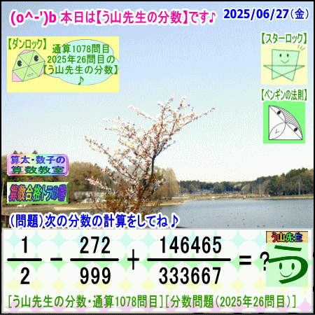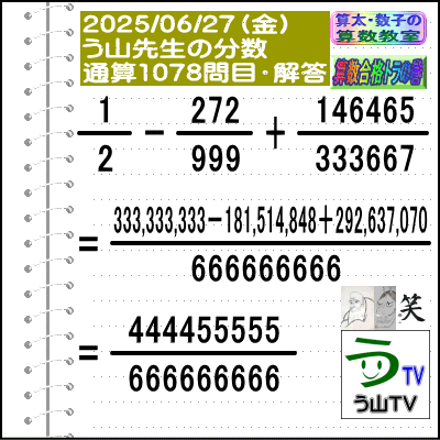 問題[う山雄一先生の分数]【分数1078問目】算数・数学天才問題[2025年6月27日]Fraction□──────────────────□【算太・数子の算数教室】(R) 【算数合格トラの巻】【う山TV(スタディ)】【う山TV(バラエティ)】【カンブリア・アカデミー】□──────────────────□(o^-')b大人気☆[う山先生式・分数計算]の問題です♪□──────────────────□□2025/06/27(金曜)□(o^-')b【う山先生の分数・通算1078問目】[分数問題(2025年26問目)]本日は2025年6月27日です。次の分数計算をしてね♪ 1/2 - 272/999 + 146465/333667 = ? 【答え】後程♪ □□──────────────────□(*^ー^)ノ通算1078問目です♪本日も面白い分数問題を作成しました☆分子・分母ともどうなるかな♪□[Fraction of Professor Uyama]доляFrakcjaFracao□──────────────────□算数・数学・家庭教師・個別指導・質問教室□──────────────────□□□□□□□□□□□□□□□□□□□□□#分数#う山先生の分数#算数#算数合格トラの巻#数学#解けたら天才#家庭教師#う山TV#う山先生#う山雄一先生#算太数子の算数教室#算太数子#算太くん#数子ちゃん #オルドビスキー博士#シルルちゃん#デボン君#白亜紀先生#カンブリアアカデミー#勉強#勉強垢#計算問題#数学垢#数学教えて#数学教える#中学受験#中学入試#高校入試#高校受験#相互フォロー□□□□□□□□□□□□□□□□□□□□□[氏名]【う山雄一】[動画]【う山TV(スタディ)】[動画]【う山TV(バラエティ)】[著書]【算太・数子の算数教室】(R)□[メインサイト]【う山先生のHP】https://uyama.theblog.me/□□[成績表・偏差値アップ]http://uyama.aikotoba.jp/seiseki/seiseki.html□□[YouTube・チャンネル]【う山TV】(スタディ)https://www.youtube.com/channel/UCnMIEU_iFTH2iP5uAH1qevQ□□[YouTube・チャンネル]【う山TV】(バラエティ)https://www.youtube.com/channel/UC32D4Nf7sEpxD_VvoaHsJaA□□[全般メール]??????@gmail.com □□[受験専用・仕事用メール]??????@gmail.com □□□□□□□□□□□□□□□□□□□□□□☆☆☆☆☆☆☆☆☆☆☆☆☆☆☆