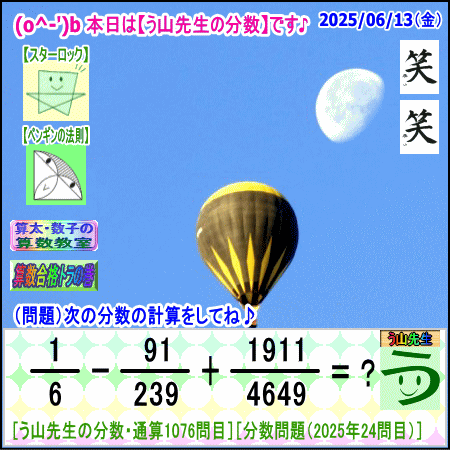問題[う山雄一先生の分数]【分数1076問目】算数・数学天才問題[2025年6月13日]Fraction□──────────────────□【算太・数子の算数教室】(R) 【算数合格トラの巻】【う山TV(スタディ)】【う山TV(バラエティ)】【カンブリア・アカデミー】□──────────────────□(o^-')b大人気☆[う山先生式・分数計算]の問題です♪□──────────────────□□2025/06/13(金曜)□(o^-')b【う山先生の分数・通算1076問目】[分数問題(2025年24問目)]本日は2025年6月13日です。次の分数計算をしてね♪ 1/6 - 91/239 + 1911/4649 = ? 【答え】後程♪ □□──────────────────□(*^ー^)ノ通算1076問目です♪本日も面白い分数問題を作成しました☆分子・分母ともどうなるかな♪□[Fraction of Professor Uyama]доляFrakcjaFracao□──────────────────□算数・数学・家庭教師・個別指導・質問教室□──────────────────□□□□□□□□□□□□□□□□□□□□□#分数#う山先生の分数#算数#算数合格トラの巻#数学#解けたら天才#家庭教師#う山TV#う山先生#う山雄一先生#算太数子の算数教室#算太数子#算太くん#数子ちゃん #オルドビスキー博士#シルルちゃん#デボン君#白亜紀先生#カンブリアアカデミー#勉強#勉強垢#計算問題#数学垢#数学教えて#数学教える#中学受験#中学入試#高校入試#高校受験#相互フォロー□□□□□□□□□□□□□□□□□□□□□[氏名]【う山雄一】[動画]【う山TV(スタディ)】[動画]【う山TV(バラエティ)】[著書]【算太・数子の算数教室】(R)□[メインサイト]【う山先生のHP】https://uyama.theblog.me/□□[成績表・偏差値アップ]http://uyama.aikotoba.jp/seiseki/seiseki.html□□[YouTube・チャンネル]【う山TV】(スタディ)https://www.youtube.com/channel/UCnMIEU_iFTH2iP5uAH1qevQ□□[YouTube・チャンネル]【う山TV】(バラエティ)https://www.youtube.com/channel/UC32D4Nf7sEpxD_VvoaHsJaA□□[全般メール]??????@gmail.com □□[受験専用・仕事用メール]??????@gmail.com □□□□□□□□□□□□□□□□□□□□□□☆☆☆☆☆☆☆☆☆☆☆☆☆☆☆