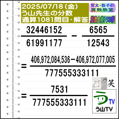 解答[う山先生の分数]【分数1081問目】算数・数学天才問題[2025年7月18日出題]Fraction□──────────────────□【カンブリア・アカデミー】【算太・数子の算数教室】(R) 【算数合格トラの巻】【う山TV】(スタディ/バラエティ)□──────────────────□(o^-')b大人気☆[う山先生式・分数計算]の問題です♪[Fraction of Professor Uyama]□──────────────────□□2025/07/18(金曜)□(o^-')b【う山先生の分数・通算1081問目】[分数問題(2025年29問目)]本日は2025年7月18日です。次の分数計算をしてね♪ 32446152/61991177 - 6565/12543 = ? □====================□♪( ´θ`)ノ【う山先生の分数・通算1081問目】[分数問題(2025年29問目)]□【答え】[7531/777555333111]です。(分子=7531→4桁)(分母=777555333111→12桁)□(解法)32446152/61991177 - 6565/12543 =406,972,084,536/777555333111-406,972,077,005/777555333111=7531/777555333111□□====================□♪( ´θ`)ノ本日も面白い分数問題を作成しました☆う山先生の分数【820問目】も参照してね♪□分子は[7531=7531が1個ずつ→4桁]分母は[777555333111=7531が3個ずつ→12桁]です☆□♪( ´ ▽ ` )ノもちろん、答えは既約分数です☆□□ ====================□(*^ー^)ノ[参考]□(32446152[8桁]=2×2×2×3×3×450641)(61991177[8桁]=素数)(6565[4桁]=5×13×101)(12543[5桁]=3×37×113)(7531[4桁]=17×443)(777555333111[12桁]=3×37×113×61991177=12543×61991177)□□□──────────────────□#分数#う山先生の分数#算数#算数合格トラの巻#数学#解けたら天才#家庭教師#う山TV#う山先生#う山雄一先生#算太数子の算数教室#算太数子#算太くん#数子ちゃん #オルドビスキー博士#シルルちゃん#デボン君#白亜紀先生#カンブリアアカデミー#勉強#勉強垢#計算問題#数学垢#数学教えて#数学教える#中学受験#中学入試#高校入試#高校受験#相互フォロー□□□□□□□□□□□□□□□□□[参考]【う山先生の分数】通算1081問目□[2013年]40問[2014年]135問[2015年]143問[2016年]131問[2017年]128問[2018年]108問[2019年]105問[2020年]52問[2021年]54問[2022年]52問[2023年]52問(通算1000問)[2024年]52問(通算1052問)□[2025年]2025/01/03(金)[1/2025]1053問目2025/01/10(金)[1/2025]1054問目2025/01/17(金)[1/2025]1055問目2025/01/24(金)[1/2025]1056問目2025/01/31(金)[1/2025]1057問目2025/02/07(金)[1/2025]1058問目2025/02/14(金)[2/3456789]1059問目2025/02/21(金)[1234567/3456789]1060問目2025/02/28(金)[1/2345678]1061問目2025/03/07(金)[1/2345678]1062問目□ 2025/03/14(金)[314/15926535897]1063問目2025/03/21(金)[1234567/2345678]1064問目2025/03/28(金)[2/34567891]1065問目2025/04/04(金)[23456789/34567891]1066問目2025/04/11(金)[12356789/44444444]1067問目2025/04/18(金)[4/98765321]1068問目2025/04/25(金)[44444444/98765321]1069問目2025/05/02(金)[5/12346789]1070問目2025/05/09(金)[5/12346789]1071問目2025/05/16(金)[55555/12346789]1072問目□ 2025/05/23(金)[55555/12346789]1073問目2025/05/30(金)[55555/12346789]1074問目2025/06/06(金)[1234567/6666666]1075問目2025/06/13(金)[1313131/6666666]1076問目2025/06/20(金)[6666665/6666666]1077問目2025/06/27(金)[444455555/666666666]1078問目2025/07/04(金)[44447777777/77777774444]1079問目2025/07/11(金)[7777777/11111111111]1080問目2025/07/18(金)[7531/777555333111]1081問目←本日(o^-')b □□□□□□□□□□□□□□□□□ □──────────────────□算数・数学・家庭教師・個別指導・質問教室□──────────────────□□□□□□□□□□□□□□□□□□□□□□[氏名]【う山雄一】[動画]【う山TV(スタディ)】[動画]【う山TV(バラエティ)】[著書]【算太・数子の算数教室】(R)□[メインサイト]【う山先生のHP】https://uyama.theblog.me/□□[成績表・偏差値アップ]http://uyama.aikotoba.jp/seiseki/seiseki.html□□[YouTube・チャンネル]【う山TV】(スタディ)https://www.youtube.com/channel/UCnMIEU_iFTH2iP5uAH1qevQ□□[YouTube・チャンネル]【う山TV】(バラエティ)https://www.youtube.com/channel/UC32D4Nf7sEpxD_VvoaHsJaA□□[全般メール]??????@gmail.com □□[受験専用・仕事用メール]??????@gmail.com □□□□□□□□□□□□□□□□□□□□□□☆☆☆☆☆☆☆☆☆☆☆☆☆☆☆