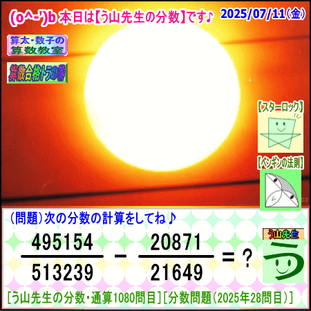 問題[う山雄一先生の分数]【分数1080問目】算数・数学天才問題[2025年7月11日]Fraction□──────────────────□【算太・数子の算数教室】(R) 【算数合格トラの巻】【う山TV(スタディ)】【う山TV(バラエティ)】【カンブリア・アカデミー】□──────────────────□(o^-')b大人気☆[う山先生式・分数計算]の問題です♪□──────────────────□□2025/07/11(金曜)□(o^-')b【う山先生の分数・通算1080問目】[分数問題(2025年28問目)]本日は2025年7月11日です。次の分数計算をしてね♪ 495154/513239 - 20871/21649 = ? 【答え】後程♪ □□──────────────────□(*^ー^)ノ通算1080問目です♪本日も面白い分数問題を作成しました☆分子・分母ともどうなるかな♪□[Fraction of Professor Uyama]доляFrakcjaFracao□──────────────────□算数・数学・家庭教師・個別指導・質問教室□──────────────────□□□□□□□□□□□□□□□□□□□□□#分数#う山先生の分数#算数#算数合格トラの巻#数学#解けたら天才#家庭教師#う山TV#う山先生#う山雄一先生#算太数子の算数教室#算太数子#算太くん#数子ちゃん #オルドビスキー博士#シルルちゃん#デボン君#白亜紀先生#カンブリアアカデミー#勉強#勉強垢#計算問題#数学垢#数学教えて#数学教える#中学受験#中学入試#高校入試#高校受験#相互フォロー□□□□□□□□□□□□□□□□□□□□□[氏名]【う山雄一】[動画]【う山TV(スタディ)】[動画]【う山TV(バラエティ)】[著書]【算太・数子の算数教室】(R)□[メインサイト]【う山先生のHP】https://uyama.theblog.me/□□[成績表・偏差値アップ]http://uyama.aikotoba.jp/seiseki/seiseki.html□□[YouTube・チャンネル]【う山TV】(スタディ)https://www.youtube.com/channel/UCnMIEU_iFTH2iP5uAH1qevQ□□[YouTube・チャンネル]【う山TV】(バラエティ)https://www.youtube.com/channel/UC32D4Nf7sEpxD_VvoaHsJaA□□[全般メール]??????@gmail.com □□[受験専用・仕事用メール]??????@gmail.com □□□□□□□□□□□□□□□□□□□□□□☆☆☆☆☆☆☆☆☆☆☆☆☆☆☆
