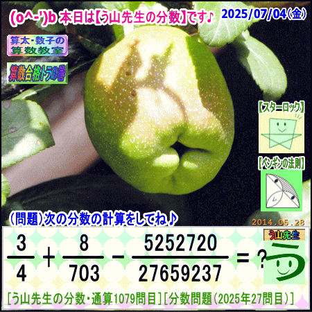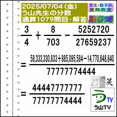 問題[う山雄一先生の分数]【分数1079問目】算数・数学天才問題[2025年7月4日]Fraction□──────────────────□【算太・数子の算数教室】(R) 【算数合格トラの巻】【う山TV(スタディ)】【う山TV(バラエティ)】【カンブリア・アカデミー】□──────────────────□(o^-')b大人気☆[う山先生式・分数計算]の問題です♪□──────────────────□□2025/07/04(金曜)□(o^-')b【う山先生の分数・通算1079問目】[分数問題(2025年27問目)]本日は2025年7月4日です。次の分数計算をしてね♪ 3/4 + 8/703 - 5252720/27659237 = ? 【答え】後程♪ □□──────────────────□(*^ー^)ノ通算1079問目です♪本日も面白い分数問題を作成しました☆分子・分母ともどうなるかな♪□[Fraction of Professor Uyama]доляFrakcjaFracao□──────────────────□算数・数学・家庭教師・個別指導・質問教室□──────────────────□□□□□□□□□□□□□□□□□□□□□#分数#う山先生の分数#算数#算数合格トラの巻#数学#解けたら天才#家庭教師#う山TV#う山先生#う山雄一先生#算太数子の算数教室#算太数子#算太くん#数子ちゃん #オルドビスキー博士#シルルちゃん#デボン君#白亜紀先生#カンブリアアカデミー#勉強#勉強垢#計算問題#数学垢#数学教えて#数学教える#中学受験#中学入試#高校入試#高校受験#相互フォロー□□□□□□□□□□□□□□□□□□□□□[氏名]【う山雄一】[動画]【う山TV(スタディ)】[動画]【う山TV(バラエティ)】[著書]【算太・数子の算数教室】(R)□[メインサイト]【う山先生のHP】https://uyama.theblog.me/□□[成績表・偏差値アップ]http://uyama.aikotoba.jp/seiseki/seiseki.html□□[YouTube・チャンネル]【う山TV】(スタディ)https://www.youtube.com/channel/UCnMIEU_iFTH2iP5uAH1qevQ□□[YouTube・チャンネル]【う山TV】(バラエティ)https://www.youtube.com/channel/UC32D4Nf7sEpxD_VvoaHsJaA□□[全般メール]??????@gmail.com □□[受験専用・仕事用メール]??????@gmail.com □□□□□□□□□□□□□□□□□□□□□□☆☆☆☆☆☆☆☆☆☆☆☆☆☆☆