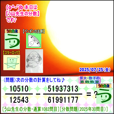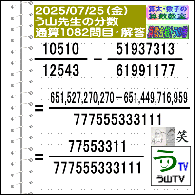 問題[う山雄一先生の分数]【分数1082問目】算数・数学天才問題[2025年7月25日]Fraction□──────────────────□【算太・数子の算数教室】(R) 【算数合格トラの巻】【う山TV(スタディ)】【う山TV(バラエティ)】【カンブリア・アカデミー】□──────────────────□(o^-')b大人気☆[う山先生式・分数計算]の問題です♪□──────────────────□□2025/07/25(金曜)□(o^-')b【う山先生の分数・通算1082問目】[分数問題(2025年30問目)]本日は2025年7月25日です。次の分数計算をしてね♪ 10510/12543 - 51937313/61991177 = ? 【答え】後程♪ □□──────────────────□(*^ー^)ノ通算1082問目です♪本日も面白い分数問題を作成しました☆分子・分母ともどうなるかな♪□[Fraction of Professor Uyama]доляFrakcjaFracao□──────────────────□算数・数学・家庭教師・個別指導・質問教室□──────────────────□□□□□□□□□□□□□□□□□□□□□#分数#う山先生の分数#算数#算数合格トラの巻#数学#解けたら天才#家庭教師#う山TV#う山先生#う山雄一先生#算太数子の算数教室#算太数子#算太くん#数子ちゃん #オルドビスキー博士#シルルちゃん#デボン君#白亜紀先生#カンブリアアカデミー#勉強#勉強垢#計算問題#数学垢#数学教えて#数学教える#中学受験#中学入試#高校入試#高校受験#相互フォロー□□□□□□□□□□□□□□□□□□□□□[氏名]【う山雄一】[動画]【う山TV(スタディ)】[動画]【う山TV(バラエティ)】[著書]【算太・数子の算数教室】(R)□[メインサイト]【う山先生のHP】https://uyama.theblog.me/□□[成績表・偏差値アップ]http://uyama.aikotoba.jp/seiseki/seiseki.html□□[YouTube・チャンネル]【う山TV】(スタディ)https://www.youtube.com/channel/UCnMIEU_iFTH2iP5uAH1qevQ□□[YouTube・チャンネル]【う山TV】(バラエティ)https://www.youtube.com/channel/UC32D4Nf7sEpxD_VvoaHsJaA□□[全般メール]??????@gmail.com □□[受験専用・仕事用メール]??????@gmail.com □□□□□□□□□□□□□□□□□□□□□□☆☆☆☆☆☆☆☆☆☆☆☆☆☆☆