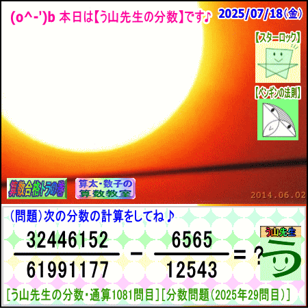 問題[う山雄一先生の分数]【分数1081問目】算数・数学天才問題[2025年7月18日]Fraction□──────────────────□【算太・数子の算数教室】(R) 【算数合格トラの巻】【う山TV(スタディ)】【う山TV(バラエティ)】【カンブリア・アカデミー】□──────────────────□(o^-')b大人気☆[う山先生式・分数計算]の問題です♪□──────────────────□□2025/07/18(金曜)□(o^-')b【う山先生の分数・通算1081問目】[分数問題(2025年29問目)]本日は2025年7月18日です。次の分数計算をしてね♪ 32446152/61991177 - 6565/12543 = ? 【答え】後程♪ □□──────────────────□(*^ー^)ノ通算1081問目です♪本日も面白い分数問題を作成しました☆分子・分母ともどうなるかな♪□[Fraction of Professor Uyama]доляFrakcjaFracao□──────────────────□算数・数学・家庭教師・個別指導・質問教室□──────────────────□□□□□□□□□□□□□□□□□□□□□#分数#う山先生の分数#算数#算数合格トラの巻#数学#解けたら天才#家庭教師#う山TV#う山先生#う山雄一先生#算太数子の算数教室#算太数子#算太くん#数子ちゃん #オルドビスキー博士#シルルちゃん#デボン君#白亜紀先生#カンブリアアカデミー#勉強#勉強垢#計算問題#数学垢#数学教えて#数学教える#中学受験#中学入試#高校入試#高校受験#相互フォロー□□□□□□□□□□□□□□□□□□□□□[氏名]【う山雄一】[動画]【う山TV(スタディ)】[動画]【う山TV(バラエティ)】[著書]【算太・数子の算数教室】(R)□[メインサイト]【う山先生のHP】https://uyama.theblog.me/□□[成績表・偏差値アップ]http://uyama.aikotoba.jp/seiseki/seiseki.html□□[YouTube・チャンネル]【う山TV】(スタディ)https://www.youtube.com/channel/UCnMIEU_iFTH2iP5uAH1qevQ□□[YouTube・チャンネル]【う山TV】(バラエティ)https://www.youtube.com/channel/UC32D4Nf7sEpxD_VvoaHsJaA□□[全般メール]??????@gmail.com □□[受験専用・仕事用メール]??????@gmail.com □□□□□□□□□□□□□□□□□□□□□□☆☆☆☆☆☆☆☆☆☆☆☆☆☆☆