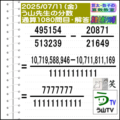 [う山先生の分数]【算数・数学】1080問目【う山先生からの挑戦状】[2025年7月11日出題]□──────────────────□(o^-')b【算数合格トラの巻】【算太・数子の算数教室】(R)【う山TV】【カンブリア・アカデミー】[Fraction of Professor Uyama]□──────────────────□□2025/07/11(金曜)□(o^-')b【う山先生の分数・通算1080問目】[分数問題(2025年28問目)]本日は2025年7月11日です。次の分数計算をしてね♪ 495154/513239 - 20871/21649 = ? □□──────────────────□□(*^ー^)ノ今回も、4年生・5年生でも、頑張れば、楽しく解ける分数問題です☆[う山先生の分数]は、2023年迄で合計【1000問】2024年迄で合計【1052問】作りました☆今年も、わかりやすく通し番号(通算番号)と、その年の作成番号でいきます♪□本日も人気の【う山雄一先生の分数問題】です!楽しく解いてみて下さい♪(^^)□[YouTube]の【う山TV】の分数動画も参照してね☆□本日も、面白い分数問題を作成しました!分母・分子はどうなるかな?頑張って、5分以内で正解して下さい。『算数は面白い!』を実感してね♪(^0^)/ □[計算問題]を楽しんで解いて、【算数は面白い!で算数合格】しましょう☆(o^-')b□う山先生の予想正答率は、堂々と正解 → 30%以下頑張って正解 → 20%以下頑張ったけど惜しくも不正解 → 30%以下約分可能かどうか悩んで不正解 → 15%以下です。□ではレッツ・ゴー!!☆(^o^)/□答えは、 ↓ ↓ ↓ ↓ ↓ ↓ ↓ ↓ ↓□ ====================□♪( ´θ`)ノ【う山先生の分数・通算1080問目】[分数問題(2025年28問目)]□【答え】[7777777/11111111111]です。(分子=7777777→7桁)(分母=11111111111→11桁)□(解法)495154/513239 - 20871/21649=10,719,588,946/11111111111 -10,711,811,169/11111111111 =7777777/11111111111□□====================□♪( ´θ`)ノ本日も面白い分数問題を作成しました☆□分子は[7777777=7が7個→7桁]分母は[11111111111=1が11個→11桁]です☆□♪( ´ ▽ ` )ノもちろん、答えは既約分数です☆□□====================□(*^ー^)ノ[参考]□(495154[6桁]=2×11×71×317)(513239[6桁]=素数)(20871[5桁]=3×3×3×773)(21649[5桁]=素数)(7777777[7桁]=7×239×4649)(11111111111[11桁]=21649×513239)□□□──────────────────□#分数#う山先生の分数#算数#算数合格トラの巻#数学#解けたら天才#家庭教師#う山TV#う山先生#う山雄一先生#算太数子の算数教室#算太数子#算太くん#数子ちゃん #オルドビスキー博士#シルルちゃん#デボン君#白亜紀先生#カンブリアアカデミー#勉強#勉強垢#計算問題#数学垢#数学教えて#数学教える#中学受験#中学入試#高校入試#高校受験#相互フォロー□□□□□□□□□□□□□□□□□[参考]【う山先生の分数】通算1080問目□[2013年]40問[2014年]135問[2015年]143問[2016年]131問[2017年]128問[2018年]108問[2019年]105問[2020年]52問[2021年]54問[2022年]52問[2023年]52問(通算1000問)[2024年]52問(通算1052問)□[2025年]2025/01/03(金)[1/2025]1053問目2025/01/10(金)[1/2025]1054問目2025/01/17(金)[1/2025]1055問目2025/01/24(金)[1/2025]1056問目2025/01/31(金)[1/2025]1057問目2025/02/07(金)[1/2025]1058問目2025/02/14(金)[2/3456789]1059問目2025/02/21(金)[1234567/3456789]1060問目2025/02/28(金)[1/2345678]1061問目2025/03/07(金)[1/2345678]1062問目□ 2025/03/14(金)[314/15926535897]1063問目2025/03/21(金)[1234567/2345678]1064問目2025/03/28(金)[2/34567891]1065問目2025/04/04(金)[23456789/34567891]1066問目2025/04/11(金)[12356789/44444444]1067問目2025/04/18(金)[4/98765321]1068問目2025/04/25(金)[44444444/98765321]1069問目2025/05/02(金)[5/12346789]1070問目2025/05/09(金)[5/12346789]1071問目2025/05/16(金)[55555/12346789]1072問目□ 2025/05/23(金)[55555/12346789]1073問目2025/05/30(金)[55555/12346789]1074問目2025/06/06(金)[1234567/6666666]1075問目2025/06/13(金)[1313131/6666666]1076問目2025/06/20(金)[6666665/6666666]1077問目2025/06/27(金)[444455555/666666666]1078問目2025/07/04(金)[44447777777/77777774444]1079問目2025/07/11(金)[7777777/11111111111]1080問目←本日(o^-')b □ □□□□□□□□□□□□□□□□□──────────────────□算数・数学・家庭教師・個別指導・質問教室□──────────────────□□□□□□□□□□□□□□□□□□□□□□[氏名]【う山雄一】[動画]【う山TV(スタディ)】[動画]【う山TV(バラエティ)】[著書]【算太・数子の算数教室】(R)□[メインサイト]【う山先生のHP】https://uyama.theblog.me/□□[成績表・偏差値アップ]http://uyama.aikotoba.jp/seiseki/seiseki.html□□[YouTube・チャンネル]【う山TV】(スタディ)https://www.youtube.com/channel/UCnMIEU_iFTH2iP5uAH1qevQ□□[YouTube・チャンネル]【う山TV】(バラエティ)https://www.youtube.com/channel/UC32D4Nf7sEpxD_VvoaHsJaA□□[全般メール]??????@gmail.com □□[受験専用・仕事用メール]??????@gmail.com □□□□□□□□□□□□□□□□□□□□□□☆☆☆☆☆☆☆☆☆☆☆☆☆☆☆