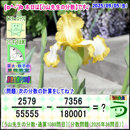 問題[う山雄一先生の分数]【分数1088問目】算数・数学天才問題[2025年9月5日]Fraction□──────────────────□【算太・数子の算数教室】(R) 【算数合格トラの巻】【う山TV(スタディ)】【う山TV(バラエティ)】【カンブリア・アカデミー】□──────────────────□(o^-')b大人気☆[う山先生式・分数計算]の問題です♪□──────────────────□□2025/09/05(金曜)□(o^-')b【う山先生の分数・通算1088問目】[分数問題(2025年36問目)]本日は2025年9月5日です。次の分数計算をしてね♪ 2579/55555 - 7356/180001 = ? 【答え】後程♪ □□──────────────────□(*^ー^)ノ通算1088問目です♪本日も面白い分数問題を作成しました☆分子・分母ともどうなるかな♪□[Fraction of Professor Uyama]доляFrakcjaFracao□──────────────────□算数・数学・家庭教師・個別指導・質問教室□──────────────────□□□□□□□□□□□□□□□□□□□□□#分数#う山先生の分数#算数#算数合格トラの巻#数学#解けたら天才#家庭教師#う山TV#う山先生#う山雄一先生#算太数子の算数教室#算太数子#算太くん#数子ちゃん #オルドビスキー博士#シルルちゃん#デボン君#白亜紀先生#カンブリアアカデミー#勉強#勉強垢#計算問題#数学垢#数学教えて#数学教える#中学受験#中学入試#高校入試#高校受験#相互フォロー□□□□□□□□□□□□□□□□□□□□□[氏名]【う山雄一】[動画]【う山TV(スタディ)】[動画]【う山TV(バラエティ)】[著書]【算太・数子の算数教室】(R)□[メインサイト]【う山先生のHP】https://uyama.theblog.me/□□[成績表・偏差値アップ]http://uyama.aikotoba.jp/seiseki/seiseki.html□□[YouTube・チャンネル]【う山TV】(スタディ)https://www.youtube.com/channel/UCnMIEU_iFTH2iP5uAH1qevQ□□[YouTube・チャンネル]【う山TV】(バラエティ)https://www.youtube.com/channel/UC32D4Nf7sEpxD_VvoaHsJaA□□[全般メール]??????@gmail.com □□[受験専用・仕事用メール]??????@gmail.com □□□□□□□□□□□□□□□□□□□□□□☆☆☆☆☆☆☆☆☆☆☆☆☆☆☆