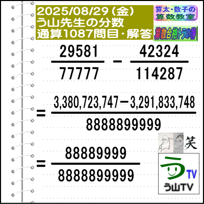 解答[う山先生の分数]【分数1087問目】算数・数学天才問題[2025年8月29日出題]Fraction□──────────────────□【カンブリア・アカデミー】【算太・数子の算数教室】(R) 【算数合格トラの巻】【う山TV】(スタディ/バラエティ)□──────────────────□(o^-')b大人気☆[う山先生式・分数計算]の問題です♪[Fraction of Professor Uyama]□──────────────────□□2025/08/29(金曜)□(o^-')b【う山先生の分数・通算1087問目】[分数問題(2025年35問目)]本日は2025年8月29日です。次の分数計算をしてね♪ 29581/77777 - 42324/114287 = ? □====================□♪( ´θ`)ノ【う山先生の分数・通算1087問目】[分数問題(2025年35問目)]□【答え】[88889999/8888899999]です。(分子=88889999→8桁)(分母=8888899999→10桁)□(解法)29581/77777 - 42324/114287=3,380,723,747/8888899999-3,291,833,748/8888899999=88889999/8888899999□□====================□♪( ´θ`)ノ本日も面白い分数問題を作成しました☆□分子は[88889999=8が4個+9が4個→8桁]分母は[8888899999=8が5個+9が5個→10桁]です☆□♪( ´ ▽ ` )ノもちろん、答えは既約分数です☆□□ ====================□(*^ー^)ノ[参考]□(29581[5桁]=素数)(77777[5桁]=7×41×271)(42324[5桁]=2×2×3×3527)(114287[6桁]=23×4969)(88889999[8桁]=11×19×101×4211)(8888899999[10桁]=7×23×41×271×4969=77777×114287)□□□──────────────────□#分数#う山先生の分数#算数#算数合格トラの巻#数学#解けたら天才#家庭教師#う山TV#う山先生#う山雄一先生#算太数子の算数教室#算太数子#算太くん#数子ちゃん #オルドビスキー博士#シルルちゃん#デボン君#白亜紀先生#カンブリアアカデミー#勉強#勉強垢#計算問題#数学垢#数学教えて#数学教える#中学受験#中学入試#高校入試#高校受験#相互フォロー□□□□□□□□□□□□□□□□□[参考]【う山先生の分数】通算1087問目□[2013年]40問[2014年]135問[2015年]143問[2016年]131問[2017年]128問[2018年]108問[2019年]105問[2020年]52問[2021年]54問[2022年]52問[2023年]52問(通算1000問)[2024年]52問(通算1052問)□[2025年]2025/01/03(金)[1/2025]1053問目2025/01/10(金)[1/2025]1054問目2025/01/17(金)[1/2025]1055問目2025/01/24(金)[1/2025]1056問目2025/01/31(金)[1/2025]1057問目2025/02/07(金)[1/2025]1058問目2025/02/14(金)[2/3456789]1059問目2025/02/21(金)[1234567/3456789]1060問目2025/02/28(金)[1/2345678]1061問目2025/03/07(金)[1/2345678]1062問目□ 2025/03/14(金)[314/15926535897]1063問目2025/03/21(金)[1234567/2345678]1064問目2025/03/28(金)[2/34567891]1065問目2025/04/04(金)[23456789/34567891]1066問目2025/04/11(金)[12356789/44444444]1067問目2025/04/18(金)[4/98765321]1068問目2025/04/25(金)[44444444/98765321]1069問目2025/05/02(金)[5/12346789]1070問目2025/05/09(金)[5/12346789]1071問目2025/05/16(金)[55555/12346789]1072問目□ 2025/05/23(金)[55555/12346789]1073問目2025/05/30(金)[55555/12346789]1074問目2025/06/06(金)[1234567/6666666]1075問目2025/06/13(金)[1313131/6666666]1076問目2025/06/20(金)[6666665/6666666]1077問目2025/06/27(金)[444455555/666666666]1078問目2025/07/04(金)[44447777777/77777774444]1079問目2025/07/11(金)[7777777/11111111111]1080問目2025/07/18(金)[7531/777555333111]1081問目2025/07/25(金)[77553311/777555333111]1082問目□2025/08/01(金)[1/888818888]1083問目2025/08/08(金)[1/88888188888]1084問目2025/08/15(金)[155555/88888888]1085問目2025/08/22(金) [777717777/8888228888]1086問目2025/08/29(金) [88889999/8888899999]1087問目←本日(o^-')b □□□□□□□□□□□□□□□□□ □──────────────────□算数・数学・家庭教師・個別指導・質問教室□──────────────────□□□□□□□□□□□□□□□□□□□□□□[氏名]【う山雄一】[動画]【う山TV(スタディ)】[動画]【う山TV(バラエティ)】[著書]【算太・数子の算数教室】(R)□[メインサイト]【う山先生のHP】https://uyama.theblog.me/□□[成績表・偏差値アップ]http://uyama.aikotoba.jp/seiseki/seiseki.html□□[YouTube・チャンネル]【う山TV】(スタディ)https://www.youtube.com/channel/UCnMIEU_iFTH2iP5uAH1qevQ□□[YouTube・チャンネル]【う山TV】(バラエティ)https://www.youtube.com/channel/UC32D4Nf7sEpxD_VvoaHsJaA□□[全般メール]??????@gmail.com □□[受験専用・仕事用メール]??????@gmail.com □□□□□□□□□□□□□□□□□□□□□□☆☆☆☆☆☆☆☆☆☆☆☆☆☆☆