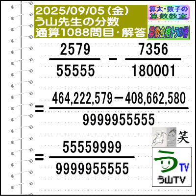 解答[う山先生の分数]【分数1088問目】算数・数学天才問題[2025年9月5日出題]Fraction□──────────────────□【カンブリア・アカデミー】【算太・数子の算数教室】(R) 【算数合格トラの巻】【う山TV】(スタディ/バラエティ)□──────────────────□(o^-')b大人気☆[う山先生式・分数計算]の問題です♪[Fraction of Professor Uyama]□──────────────────□□2025/09/05(金曜)□(o^-')b【う山先生の分数・通算1088問目】[分数問題(2025年36問目)]本日は2025年9月5日です。次の分数計算をしてね♪ 2579/55555 - 7356/180001 = ? □====================□♪( ´θ`)ノ【う山先生の分数・通算1088問目】[分数問題(2025年36問目)]□【答え】[55559999/9999955555]です。(分子=55559999→8桁)(分母=9999955555→10桁)□(解法)2579/55555 - 7356/180001=464,222,579/9999955555-408,662,580/9999955555=55559999/9999955555□□====================□♪( ´θ`)ノ本日も面白い分数問題を作成しました☆□分子は[55559999=5が4個+9が4個→8桁]分母は[9999955555=9が5個+5が5個→10桁]です☆□♪( ´ ▽ ` )ノもちろん、答えは既約分数です☆□□ ====================□(*^ー^)ノ[参考]□(2579[4桁]=素数)(55555[5桁]=5×41×271)(7356[4桁]=2×2×3×613)(180001[6桁]=素数)(55559999[8桁]=11×43×101×1163)(9999955555[10桁]=5×41×271×180001=55555×180001)□□□──────────────────□#分数#う山先生の分数#算数#算数合格トラの巻#数学#解けたら天才#家庭教師#う山TV#う山先生#う山雄一先生#算太数子の算数教室#算太数子#算太くん#数子ちゃん #オルドビスキー博士#シルルちゃん#デボン君#白亜紀先生#カンブリアアカデミー#勉強#勉強垢#計算問題#数学垢#数学教えて#数学教える#中学受験#中学入試#高校入試#高校受験#相互フォロー□□□□□□□□□□□□□□□□□[参考]【う山先生の分数】通算1088問目□[2013年]40問[2014年]135問[2015年]143問[2016年]131問[2017年]128問[2018年]108問[2019年]105問[2020年]52問[2021年]54問[2022年]52問[2023年]52問(通算1000問)[2024年]52問(通算1052問)□[2025年]2025/01/03(金)[1/2025]1053問目2025/01/10(金)[1/2025]1054問目2025/01/17(金)[1/2025]1055問目2025/01/24(金)[1/2025]1056問目2025/01/31(金)[1/2025]1057問目2025/02/07(金)[1/2025]1058問目2025/02/14(金)[2/3456789]1059問目2025/02/21(金)[1234567/3456789]1060問目2025/02/28(金)[1/2345678]1061問目2025/03/07(金)[1/2345678]1062問目□ 2025/03/14(金)[314/15926535897]1063問目2025/03/21(金)[1234567/2345678]1064問目2025/03/28(金)[2/34567891]1065問目2025/04/04(金)[23456789/34567891]1066問目2025/04/11(金)[12356789/44444444]1067問目2025/04/18(金)[4/98765321]1068問目2025/04/25(金)[44444444/98765321]1069問目2025/05/02(金)[5/12346789]1070問目2025/05/09(金)[5/12346789]1071問目2025/05/16(金)[55555/12346789]1072問目□ 2025/05/23(金)[55555/12346789]1073問目2025/05/30(金)[55555/12346789]1074問目2025/06/06(金)[1234567/6666666]1075問目2025/06/13(金)[1313131/6666666]1076問目2025/06/20(金)[6666665/6666666]1077問目2025/06/27(金)[444455555/666666666]1078問目2025/07/04(金)[44447777777/77777774444]1079問目2025/07/11(金)[7777777/11111111111]1080問目2025/07/18(金)[7531/777555333111]1081問目2025/07/25(金)[77553311/777555333111]1082問目□2025/08/01(金)[1/888818888]1083問目2025/08/08(金)[1/88888188888]1084問目2025/08/15(金)[155555/88888888]1085問目2025/08/22(金) [777717777/8888228888]1086問目2025/08/29(金) [88889999/8888899999]1087問目2025/09/05(金) [55559999/9999955555]1088問目←本日(o^-')b □□□□□□□□□□□□□□□□□ □──────────────────□算数・数学・家庭教師・個別指導・質問教室□──────────────────□□□□□□□□□□□□□□□□□□□□□□[氏名]【う山雄一】[動画]【う山TV(スタディ)】[動画]【う山TV(バラエティ)】[著書]【算太・数子の算数教室】(R)□[メインサイト]【う山先生のHP】https://uyama.theblog.me/□□[成績表・偏差値アップ]http://uyama.aikotoba.jp/seiseki/seiseki.html□□[YouTube・チャンネル]【う山TV】(スタディ)https://www.youtube.com/channel/UCnMIEU_iFTH2iP5uAH1qevQ□□[YouTube・チャンネル]【う山TV】(バラエティ)https://www.youtube.com/channel/UC32D4Nf7sEpxD_VvoaHsJaA□□[全般メール]??????@gmail.com □□[受験専用・仕事用メール]??????@gmail.com □□□□□□□□□□□□□□□□□□□□□□☆☆☆☆☆☆☆☆☆☆☆☆☆☆☆