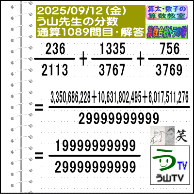 [う山先生の分数]【算数・数学】1089問目【う山先生からの挑戦状】[2025年9月12日出題]□──────────────────□(o^-')b【算数合格トラの巻】【算太・数子の算数教室】(R)【う山TV】【カンブリア・アカデミー】[Fraction of Professor Uyama]□──────────────────□□2025/09/12(金曜)□(o^-')b【う山先生の分数・通算1089問目】[分数問題(2025年37問目)]本日は2025年9月12日です。次の分数計算をしてね♪ 236/2113 + 1335/3767 + 756/3769 = ? □□──────────────────□□(*^ー^)ノ今回も、4年生・5年生でも、頑張れば、楽しく解ける分数問題です☆[う山先生の分数]は、2023年迄で合計【1000問】2024年迄で合計【1052問】作りました☆今年も、わかりやすく通し番号(通算番号)と、その年の作成番号でいきます♪□本日も人気の【う山雄一先生の分数問題】です!楽しく解いてみて下さい♪(^^)□[YouTube]の【う山TV】の分数動画も参照してね☆□本日も、面白い分数問題を作成しました!分母・分子はどうなるかな?頑張って、5分以内で正解して下さい。『算数は面白い!』を実感してね♪(^0^)/ □[計算問題]を楽しんで解いて、【算数は面白い!で算数合格】しましょう☆(o^-')b□う山先生の予想正答率は、堂々と正解 → 30%以下頑張って正解 → 20%以下頑張ったけど惜しくも不正解 → 30%以下約分可能かどうか悩んで不正解 → 20%以下です。□ではレッツ・ゴー!!☆(^o^)/□答えは、 ↓ ↓ ↓ ↓ ↓ ↓ ↓ ↓ ↓□ ====================□♪( ´θ`)ノ【う山先生の分数・通算1089問目】[分数問題(2025年37問目)]□【答え】[19999999999/29999999999]です。(分子=19999999999→11桁)(分母=29999999999→11桁)□(解法)236/2113 + 1335/3767 + 756/3769 =3,350,686,228/29999999999+10,631,802,495/29999999999+6,017,511,276/29999999999=19999999999/29999999999□□====================□♪( ´θ`)ノ本日も面白い分数問題を作成しました☆□分子は[19999999999=1が1個+9が10個→11桁]分母は[29999999999=2が1個+9が10個→11桁]です☆□♪( ´ ▽ ` )ノもちろん、答えは既約分数です☆□□====================□(*^ー^)ノ[参考]□(236[3桁]=2×2×59)(2113[4桁]=素数) (1335[4桁]=3×5×89)(3767[4桁]=素数) (756[3桁]=2×2×3×3×3×7)(3769[4桁]=素数) (19999999999[11桁]=7×97×193×152617)(29999999999[11桁]=2113×3767×3769)□□□──────────────────□#分数#う山先生の分数#算数#算数合格トラの巻#数学#解けたら天才#家庭教師#う山TV#う山先生#う山雄一先生#算太数子の算数教室#算太数子#算太くん#数子ちゃん #オルドビスキー博士#シルルちゃん#デボン君#白亜紀先生#カンブリアアカデミー#勉強#勉強垢#計算問題#数学垢#数学教えて#数学教える#中学受験#中学入試#高校入試#高校受験#相互フォロー□□□□□□□□□□□□□□□□□[参考]【う山先生の分数】通算1089問目□[2013年]40問[2014年]135問[2015年]143問[2016年]131問[2017年]128問[2018年]108問[2019年]105問[2020年]52問[2021年]54問[2022年]52問[2023年]52問(通算1000問)[2024年]52問(通算1052問)□[2025年]2025/01/03(金)[1/2025]1053問目2025/01/10(金)[1/2025]1054問目2025/01/17(金)[1/2025]1055問目2025/01/24(金)[1/2025]1056問目2025/01/31(金)[1/2025]1057問目2025/02/07(金)[1/2025]1058問目2025/02/14(金)[2/3456789]1059問目2025/02/21(金)[1234567/3456789]1060問目2025/02/28(金)[1/2345678]1061問目2025/03/07(金)[1/2345678]1062問目□ 2025/03/14(金)[314/15926535897]1063問目2025/03/21(金)[1234567/2345678]1064問目2025/03/28(金)[2/34567891]1065問目2025/04/04(金)[23456789/34567891]1066問目2025/04/11(金)[12356789/44444444]1067問目2025/04/18(金)[4/98765321]1068問目2025/04/25(金)[44444444/98765321]1069問目2025/05/02(金)[5/12346789]1070問目2025/05/09(金)[5/12346789]1071問目2025/05/16(金)[55555/12346789]1072問目□ 2025/05/23(金)[55555/12346789]1073問目2025/05/30(金)[55555/12346789]1074問目2025/06/06(金)[1234567/6666666]1075問目2025/06/13(金)[1313131/6666666]1076問目2025/06/20(金)[6666665/6666666]1077問目2025/06/27(金)[444455555/666666666]1078問目2025/07/04(金)[44447777777/77777774444]1079問目2025/07/11(金)[7777777/11111111111]1080問目2025/07/18(金)[7531/777555333111]1081問目2025/07/25(金)[77553311/777555333111]1082問目□2025/08/01(金)[1/888818888]1083問目2025/08/08(金)[1/88888188888]1084問目2025/08/15(金)[155555/88888888]1085問目2025/08/22(金) [777717777/8888228888]1086問目2025/08/29(金) [88889999/8888899999]1087問目2025/09/05(金) [55559999/9999955555]1088問目2025/09/12(金) [19999999999/29999999999]1089問目←本日(o^-')b□□□□□□□□□□□□□□□□□□──────────────────□算数・数学・家庭教師・個別指導・質問教室□──────────────────□□□□□□□□□□□□□□□□□□□□□□[氏名]【う山雄一】[動画]【う山TV(スタディ)】[動画]【う山TV(バラエティ)】[著書]【算太・数子の算数教室】(R)□[メインサイト]【う山先生のHP】https://uyama.theblog.me/□□[成績表・偏差値アップ]http://uyama.aikotoba.jp/seiseki/seiseki.html□□[YouTube・チャンネル]【う山TV】(スタディ)https://www.youtube.com/channel/UCnMIEU_iFTH2iP5uAH1qevQ□□[YouTube・チャンネル]【う山TV】(バラエティ)https://www.youtube.com/channel/UC32D4Nf7sEpxD_VvoaHsJaA□□[全般メール]??????@gmail.com □□[受験専用・仕事用メール]??????@gmail.com □□□