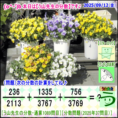 問題[う山雄一先生の分数]【分数1089問目】算数・数学天才問題[2025年9月12日]Fraction□──────────────────□【算太・数子の算数教室】(R) 【算数合格トラの巻】【う山TV(スタディ)】【う山TV(バラエティ)】【カンブリア・アカデミー】□──────────────────□(o^-')b大人気☆[う山先生式・分数計算]の問題です♪□──────────────────□□2025/09/12(金曜)□(o^-')b【う山先生の分数・通算1089問目】[分数問題(2025年37問目)]本日は2025年9月12日です。次の分数計算をしてね♪ 236/2113 + 1335/3767 + 756/3769 = ? 【答え】後程♪ □□──────────────────□(*^ー^)ノ通算1089問目です♪本日も面白い分数問題を作成しました☆分子・分母ともどうなるかな♪□[Fraction of Professor Uyama]доляFrakcjaFracao□──────────────────□算数・数学・家庭教師・個別指導・質問教室□──────────────────□□□□□□□□□□□□□□□□□□□□□#分数#う山先生の分数#算数#算数合格トラの巻#数学#解けたら天才#家庭教師#う山TV#う山先生#う山雄一先生#算太数子の算数教室#算太数子#算太くん#数子ちゃん #オルドビスキー博士#シルルちゃん#デボン君#白亜紀先生#カンブリアアカデミー#勉強#勉強垢#計算問題#数学垢#数学教えて#数学教える#中学受験#中学入試#高校入試#高校受験#相互フォロー□□□□□□□□□□□□□□□□□□□□□[氏名]【う山雄一】[動画]【う山TV(スタディ)】[動画]【う山TV(バラエティ)】[著書]【算太・数子の算数教室】(R)□[メインサイト]【う山先生のHP】https://uyama.theblog.me/□□[成績表・偏差値アップ]http://uyama.aikotoba.jp/seiseki/seiseki.html□□[YouTube・チャンネル]【う山TV】(スタディ)https://www.youtube.com/channel/UCnMIEU_iFTH2iP5uAH1qevQ□□[YouTube・チャンネル]【う山TV】(バラエティ)https://www.youtube.com/channel/UC32D4Nf7sEpxD_VvoaHsJaA□□[全般メール]??????@gmail.com □□[受験専用・仕事用メール]??????@gmail.com □□□□□□□□□□□□□□□□□□□□□□☆☆☆☆☆☆☆☆☆☆☆☆☆☆☆
