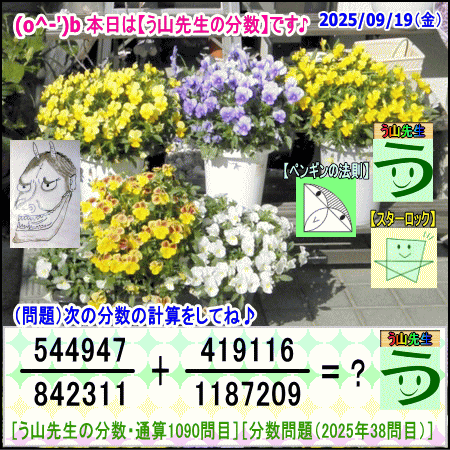 問題[う山雄一先生の分数]【分数1090問目】算数・数学天才問題[2025年9月19日]Fraction□──────────────────□【算太・数子の算数教室】(R) 【算数合格トラの巻】【う山TV(スタディ)】【う山TV(バラエティ)】【カンブリア・アカデミー】□──────────────────□(o^-')b大人気☆[う山先生式・分数計算]の問題です♪□──────────────────□□2025/09/19(金曜)□(o^-')b【う山先生の分数・通算1090問目】[分数問題(2025年38問目)]本日は2025年9月19日です。次の分数計算をしてね♪ 544947/842311 + 419116/1187209 = ? 【答え】後程♪ □□──────────────────□(*^ー^)ノ通算1090問目です♪本日も面白い分数問題を作成しました☆分子・分母ともどうなるかな♪□[Fraction of Professor Uyama]доляFrakcjaFracao□──────────────────□算数・数学・家庭教師・個別指導・質問教室□──────────────────□□□□□□□□□□□□□□□□□□□□□#分数#う山先生の分数#算数#算数合格トラの巻#数学#解けたら天才#家庭教師#う山TV#う山先生#う山雄一先生#算太数子の算数教室#算太数子#算太くん#数子ちゃん #オルドビスキー博士#シルルちゃん#デボン君#白亜紀先生#カンブリアアカデミー#勉強#勉強垢#計算問題#数学垢#数学教えて#数学教える#中学受験#中学入試#高校入試#高校受験#相互フォロー□□□□□□□□□□□□□□□□□□□□□[氏名]【う山雄一】[動画]【う山TV(スタディ)】[動画]【う山TV(バラエティ)】[著書]【算太・数子の算数教室】(R)□[メインサイト]【う山先生のHP】https://uyama.theblog.me/□□[成績表・偏差値アップ]http://uyama.aikotoba.jp/seiseki/seiseki.html□□[YouTube・チャンネル]【う山TV】(スタディ)https://www.youtube.com/channel/UCnMIEU_iFTH2iP5uAH1qevQ□□[YouTube・チャンネル]【う山TV】(バラエティ)https://www.youtube.com/channel/UC32D4Nf7sEpxD_VvoaHsJaA□□[全般メール]??????@gmail.com □□[受験専用・仕事用メール]??????@gmail.com □□□□□□□□□□□□□□□□□□□□□□☆☆☆☆☆☆☆☆☆☆☆☆☆☆☆