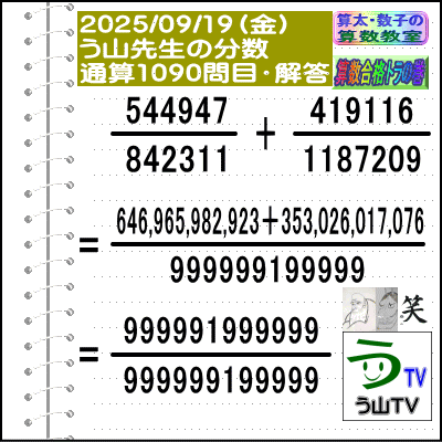 [う山先生の分数]【算数・数学】1090問目【う山先生からの挑戦状】[2025年9月19日出題]□──────────────────□(o^-')b【算数合格トラの巻】【算太・数子の算数教室】(R)【う山TV】【カンブリア・アカデミー】[Fraction of Professor Uyama]□──────────────────□□2025/09/19(金曜)□(o^-')b【う山先生の分数・通算1090問目】[分数問題(2025年38問目)]本日は2025年9月19日です。次の分数計算をしてね♪ 544947/842311 + 419116/1187209 = ? □□──────────────────□□(*^ー^)ノ今回も、4年生・5年生でも、頑張れば、楽しく解ける分数問題です☆[う山先生の分数]は、2023年迄で合計【1000問】2024年迄で合計【1052問】作りました☆今年も、わかりやすく通し番号(通算番号)と、その年の作成番号でいきます♪□本日も人気の【う山雄一先生の分数問題】です!楽しく解いてみて下さい♪(^^)□[YouTube]の【う山TV】の分数動画も参照してね☆□本日も、面白い分数問題を作成しました!分母・分子はどうなるかな?頑張って、5分以内で正解して下さい。『算数は面白い!』を実感してね♪(^0^)/ □[計算問題]を楽しんで解いて、【算数は面白い!で算数合格】しましょう☆(o^-')b□う山先生の予想正答率は、堂々と正解 → 30%以下頑張って正解 → 20%以下頑張ったけど惜しくも不正解 → 30%以下約分可能かどうか悩んで不正解 → 20%以下です。□ではレッツ・ゴー!!☆(^o^)/□答えは、 ↓ ↓ ↓ ↓ ↓ ↓ ↓ ↓ ↓□ ====================□♪( ´θ`)ノ【う山先生の分数・通算1090問目】[分数問題(2025年38問目)]□【答え】[999991999999/999999199999]です。(分子=999991999999→12桁)(分母=999999199999→12桁)□(解法)544947/842311 + 419116/1187209=646,965,982,923/999999199999+353,026,017,076/999999199999=999991999999/999999199999□□====================□♪( ´θ`)ノ本日も面白い分数問題を作成しました☆□分子は[999991999999=9が5個+1+9が6個→12桁]分母は[999999199999=9が6個+1+9が5個→12桁]です☆□♪( ´ ▽ ` )ノもちろん、答えは既約分数です☆□□====================□(*^ー^)ノ[参考]□(544947[6桁]=3×13×89×157)(842311[6桁]=素数)(419116[6桁]=2×2×104779)(1187209[7桁]=313×3793)(999991999999[12桁]=1597×626169067)(999999199999[12桁]=313×3793×842311=842311×1187209)□□□──────────────────□#分数#う山先生の分数#算数#算数合格トラの巻#数学#解けたら天才#家庭教師#う山TV#う山先生#う山雄一先生#算太数子の算数教室#算太数子#算太くん#数子ちゃん #オルドビスキー博士#シルルちゃん#デボン君#白亜紀先生#カンブリアアカデミー#勉強#勉強垢#計算問題#数学垢#数学教えて#数学教える#中学受験#中学入試#高校入試#高校受験#相互フォロー□□□□□□□□□□□□□□□□□[参考]【う山先生の分数】通算1090問目□[2013年]40問[2014年]135問[2015年]143問[2016年]131問[2017年]128問[2018年]108問[2019年]105問[2020年]52問[2021年]54問[2022年]52問[2023年]52問(通算1000問)[2024年]52問(通算1052問)□[2025年]2025/01/03(金)[1/2025]1053問目2025/01/10(金)[1/2025]1054問目2025/01/17(金)[1/2025]1055問目2025/01/24(金)[1/2025]1056問目2025/01/31(金)[1/2025]1057問目2025/02/07(金)[1/2025]1058問目2025/02/14(金)[2/3456789]1059問目2025/02/21(金)[1234567/3456789]1060問目2025/02/28(金)[1/2345678]1061問目2025/03/07(金)[1/2345678]1062問目□ 2025/03/14(金)[314/15926535897]1063問目2025/03/21(金)[1234567/2345678]1064問目2025/03/28(金)[2/34567891]1065問目2025/04/04(金)[23456789/34567891]1066問目2025/04/11(金)[12356789/44444444]1067問目2025/04/18(金)[4/98765321]1068問目2025/04/25(金)[44444444/98765321]1069問目2025/05/02(金)[5/12346789]1070問目2025/05/09(金)[5/12346789]1071問目2025/05/16(金)[55555/12346789]1072問目□ 2025/05/23(金)[55555/12346789]1073問目2025/05/30(金)[55555/12346789]1074問目2025/06/06(金)[1234567/6666666]1075問目2025/06/13(金)[1313131/6666666]1076問目2025/06/20(金)[6666665/6666666]1077問目2025/06/27(金)[444455555/666666666]1078問目2025/07/04(金)[44447777777/77777774444]1079問目2025/07/11(金)[7777777/11111111111]1080問目2025/07/18(金)[7531/777555333111]1081問目2025/07/25(金)[77553311/777555333111]1082問目□2025/08/01(金)[1/888818888]1083問目2025/08/08(金)[1/88888188888]1084問目2025/08/15(金)[155555/88888888]1085問目2025/08/22(金) [777717777/8888228888]1086問目2025/08/29(金) [88889999/8888899999]1087問目2025/09/05(金) [55559999/9999955555]1088問目2025/09/12(金) [19999999999/29999999999]1089問目2025/09/19(金) [999991999999/999999199999]1090問目←本日(o^-')b □□□□□□□□□□□□□□□□□□──────────────────□算数・数学・家庭教師・個別指導・質問教室□──────────────────□□□□□□□□□□□□□□□□□□□□□□[氏名]【う山雄一】[動画]【う山TV(スタディ)】[動画]【う山TV(バラエティ)】[著書]【算太・数子の算数教室】(R)□[メインサイト]【う山先生のHP】https://uyama.theblog.me/□□[成績表・偏差値アップ]http://uyama.aikotoba.jp/seiseki/seiseki.html□□[YouTube・チャンネル]【う山TV】(スタディ)https://www.youtube.com/channel/UCnMIEU_iFTH2iP5uAH1qevQ□□[YouTube・チャンネル]【う山TV】(バラエティ)https://www.youtube.com/channel/UC32D4Nf7sEpxD_VvoaHsJaA□□[全般メール]??????@gmail.com □□[受験専用・仕事用メール