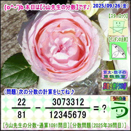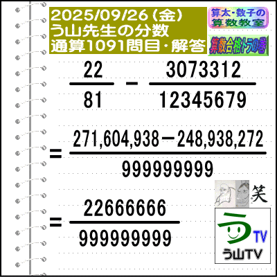 問題[う山雄一先生の分数]【分数1091問目】算数・数学天才問題[2025年9月26日]Fraction□──────────────────□【算太・数子の算数教室】(R) 【算数合格トラの巻】【う山TV(スタディ)】【う山TV(バラエティ)】【カンブリア・アカデミー】□──────────────────□(o^-')b大人気☆[う山先生式・分数計算]の問題です♪□──────────────────□□2025/09/26(金曜)□(o^-')b【う山先生の分数・通算1091問目】[分数問題(2025年39問目)]本日は2025年9月26日です。次の分数計算をしてね♪ 22/81 - 3073312/12345679 = ? 【答え】後程♪ □□──────────────────□(*^ー^)ノ通算1091問目です♪本日も面白い分数問題を作成しました☆分子・分母ともどうなるかな♪□[Fraction of Professor Uyama]доляFrakcjaFracao□──────────────────□算数・数学・家庭教師・個別指導・質問教室□──────────────────□□□□□□□□□□□□□□□□□□□□□#分数#う山先生の分数#算数#算数合格トラの巻#数学#解けたら天才#家庭教師#う山TV#う山先生#う山雄一先生#算太数子の算数教室#算太数子#算太くん#数子ちゃん #オルドビスキー博士#シルルちゃん#デボン君#白亜紀先生#カンブリアアカデミー#勉強#勉強垢#計算問題#数学垢#数学教えて#数学教える#中学受験#中学入試#高校入試#高校受験#相互フォロー□□□□□□□□□□□□□□□□□□□□□[氏名]【う山雄一】[動画]【う山TV(スタディ)】[動画]【う山TV(バラエティ)】[著書]【算太・数子の算数教室】(R)□[メインサイト]【う山先生のHP】https://uyama.theblog.me/□□[成績表・偏差値アップ]http://uyama.aikotoba.jp/seiseki/seiseki.html□□[YouTube・チャンネル]【う山TV】(スタディ)https://www.youtube.com/channel/UCnMIEU_iFTH2iP5uAH1qevQ□□[YouTube・チャンネル]【う山TV】(バラエティ)https://www.youtube.com/channel/UC32D4Nf7sEpxD_VvoaHsJaA□□[全般メール]??????@gmail.com □□[受験専用・仕事用メール]??????@gmail.com □□□□□□□□□□□□□□□□□□□□□□☆☆☆☆☆☆☆☆☆☆☆☆☆☆☆
