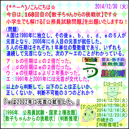 通算168回目、今年52回目の【数子ちゃんからの挑戦状】です♪
